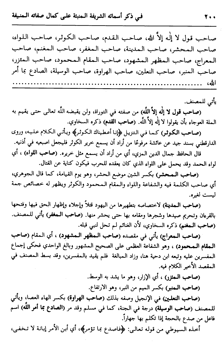 "صاحب النعلين" في الإنجيل وصفه بذلك "صاحب الهراوة" بكسر الهاء العصا، ويأتي للمصنف "صاحب الوسيلة" درجة في الجنة، كما في مسلم وقد مر "الصادع بما أمر الله" اسم فاعل من صدع بالحجة إذا تكلم بها جهارا.