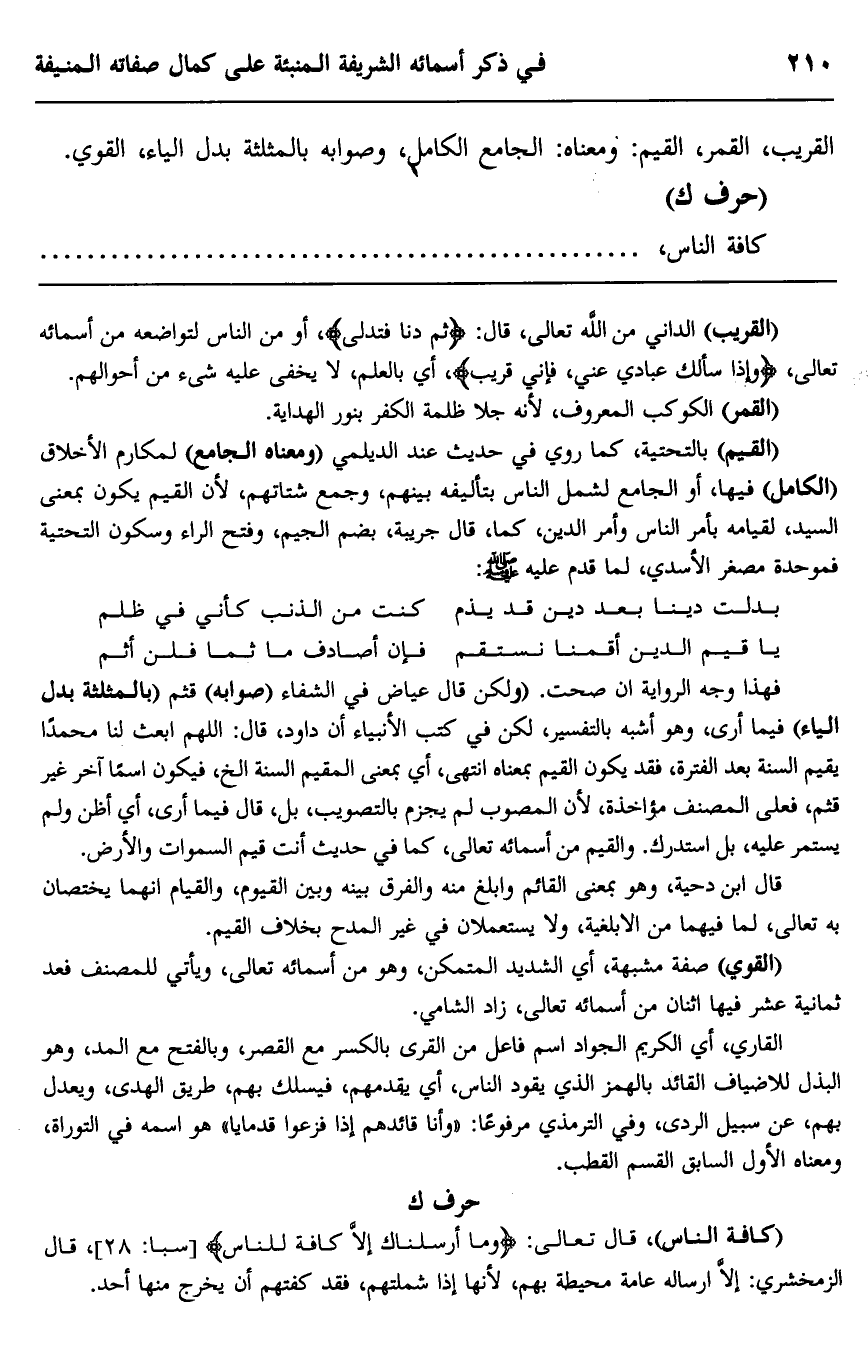 فهذا وجه الرواية إن صحت. "ولكن قال عياض في الشفاء "صوابه" فثم "بالمثلثة بدل الياء" فيما أرى، وهو أشبه بالتفسير، لكن في كتب الأنبياء أن داود، قال: اللهم ابعث لنا محمدا يقيم السنة بعد الفترة، فقد يكون القيم بمعناه انتهى. أي بمعنى المقيم السنة إلخ، فيكون اسما آخ غير قثم، فعلى المصنف مؤاخذة؛ لأن المصوب لم يجزم بالتصويب بل قال فيما أرى، أي أظن ولم يستمر عليه، بل استدرك والقيم من أسمائه تعالى، كما في حديث أنت قيم السماوات والأرض.
