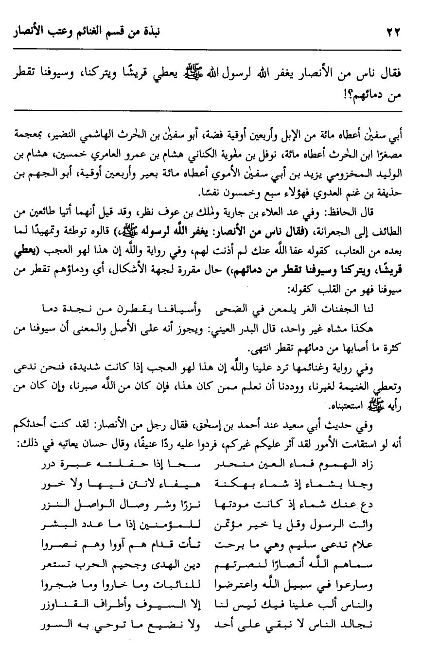 وفي حديث أبي سعيد عند أحمد بن إسحاق، فقال رجل من الأنصار: لقد كنت أحدثكم أنه لو استقامت الأمور لقد آثر عليكم غيركم، فردوا عليه ردا عنيفا، وقال حسان يعاتبه في ذلك: