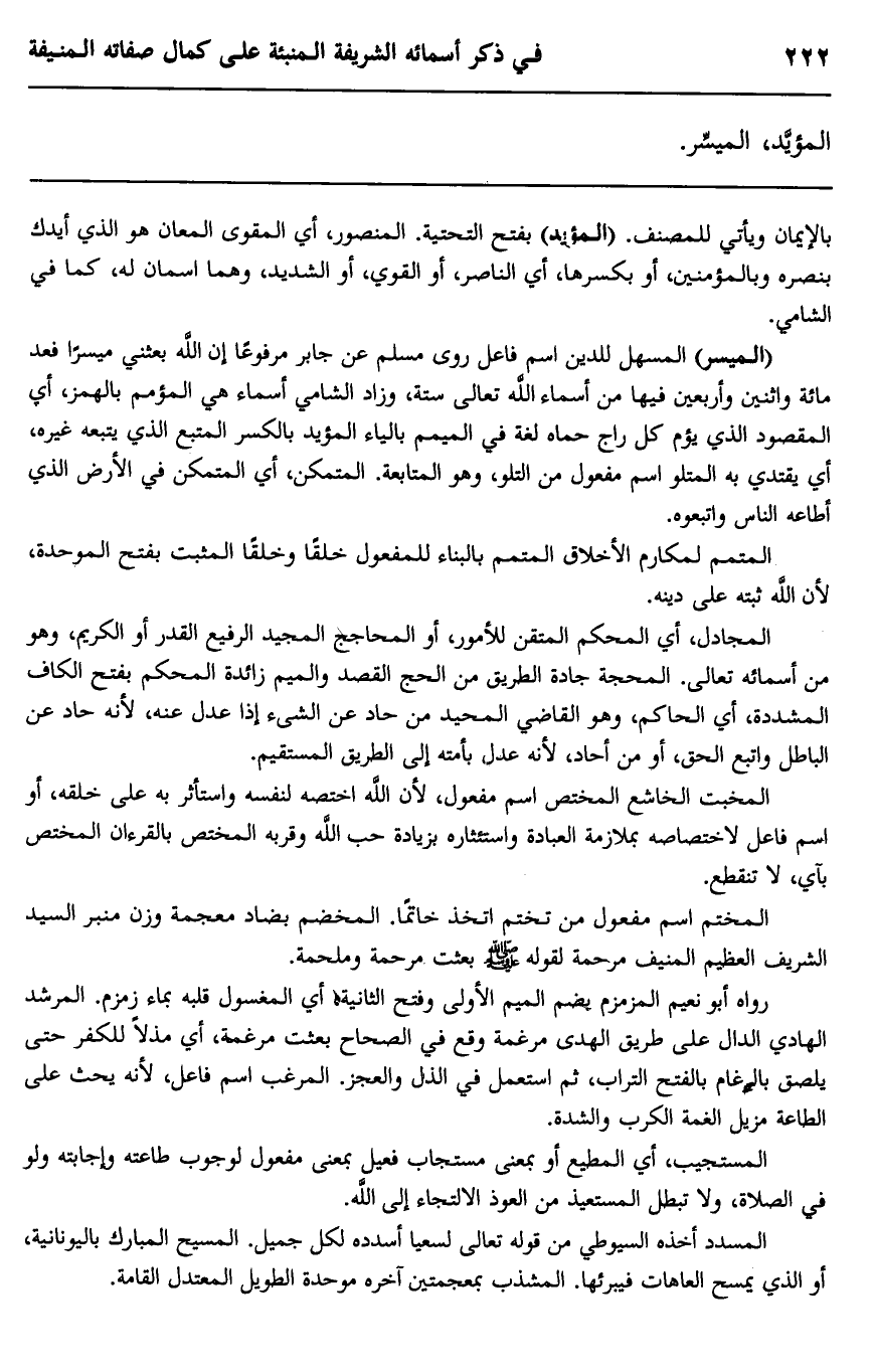 "الميسر" المسهل للدين اسم فاعل روى مسلم عن جابر مرفوعا إن الله بعثني ميسرا فعد مائة واثنين وأربعين فيها من أسماء الله تعالى ستة، وزاد الشامي أسماء هي المؤمم بالهمز، أي المقصود الذي يؤم كل راج حماه لغة في الميم بالياء المؤيد بالكسر المتبع الذي يتبعه غيره، أي يقتدي به المتلو اسم مفعول من التلو، وهو المتابعة، المتمكن، أي المتمكن في الأرض الذي أطاعه الناس واتبعوه.