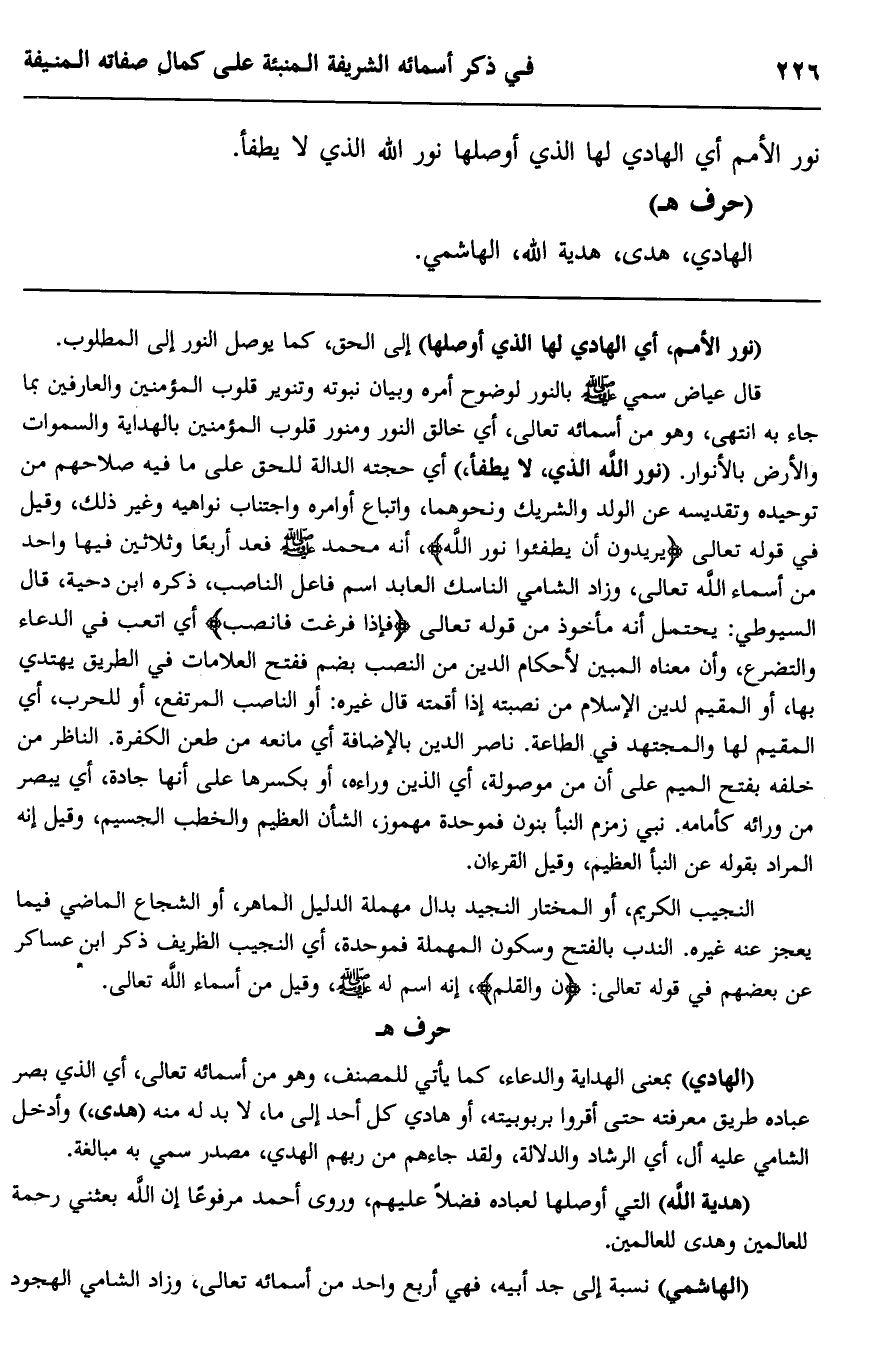قال عياض سمي صلى الله عليه وسلم بالنور لوضوح أمره وبيانه وبيان نبوته وتنوير قلوب المؤمنين والعارفين بما جاء به انتهى. وهو من أسمائه تعالى، أي خالق النور ومنور قلوب المؤمنين بالهداية والسماوات والأرض بالأنوار، "نور الله الذي، لا يطفأ،" أي حجته الدالة للحق على ما فيه صلاحهم من توحيده وتقديسه عن الولد والشريك ونحوهما، واتباع أوامره واجتناب نواهيه وغير ذلك، وقيل في قوله تعالى: {يُرِيدُونَ أَنْ يُطْفِئُوا نُورَ اللَّه} أنه محمد صلى الله عليه وسلم فعد أربعا وثلاثين فيها واحد من أسماء الله تعالى، وزاد الشامي الناسك العابد اسم فاعل الناصب، ذكره ابن دحية، قال السيوطي: يحتمل أنه مأخوذ من قوله تعالى: {فَإِذَا فَرَغْتَ فَانْصَبْ} أي اتعب في الدعاء والتضرع، وأن معناه المبين لأحكام الدين من النصب بضم ففتح العلامات في الطريق يهتدي بها، أو المقيم لدين الإسلام من نصبته إذا أقمته قال غيره: أو الناصب المرتفع، أو للحرب، أي المقيم لها والمجتهد في الطاعة ناصر الدين بالإضافة أي مانعه من طعن الكفرة. الناظر من خلفه بفتح الميم على أن من موصولة، أي الذين وراءه، أو بكسرها على أنها جادة، أي يبصر من ورائه كأمامه. نبي زمزم النبأ بنون فموحدة مهموز، الشأن العظيم والخطب الجسيم، وقيل إنه المراد بقوله عن النبأ العظيم، وقيل القرآن.