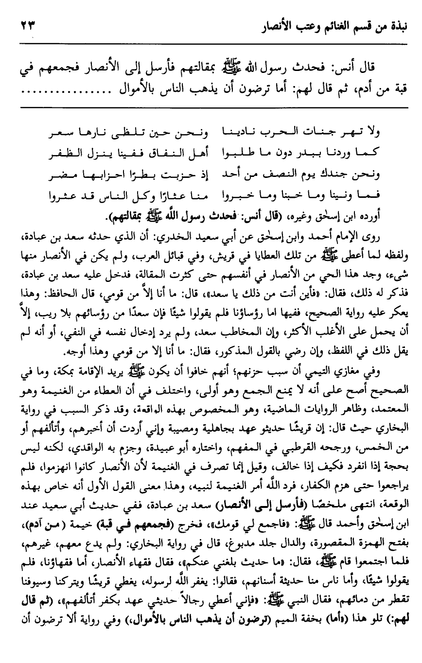 قال أنس: فحدث رسول الله صلى الله عليه وسلم بمقالتهم، فأرسل إلى الأنصار فجمعهم في قبة من أدم، ثم قال لهم: "أما ترضون أن يذهب الناس بالأموال