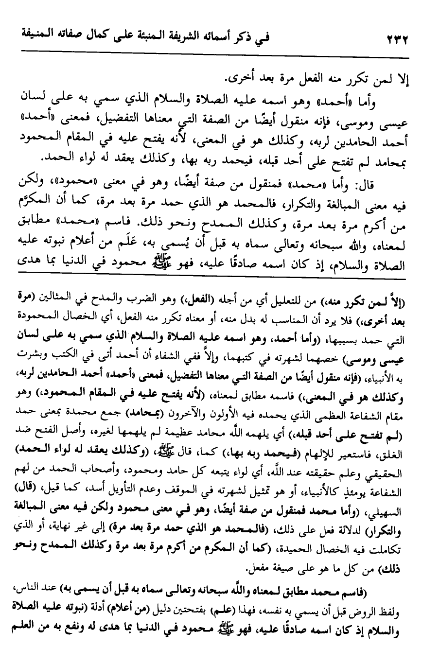 وأما "أحمد" وهو اسمه عليه الصلاة والسلام الذي سمي به على لسان عيسى وموسى، فإنه منقول أيضا من الصفة التي معناها التفضيل، فمعنى "أحمد" أحمد الحامدين لربه، وكذلك هو في المعنى؛ لأنه يفتح عليه في المقام المحمود بمحامد لم تفتح على أحد قبله، فيحمد ربه بها، وكذلك يعقد له لواء الحمد.