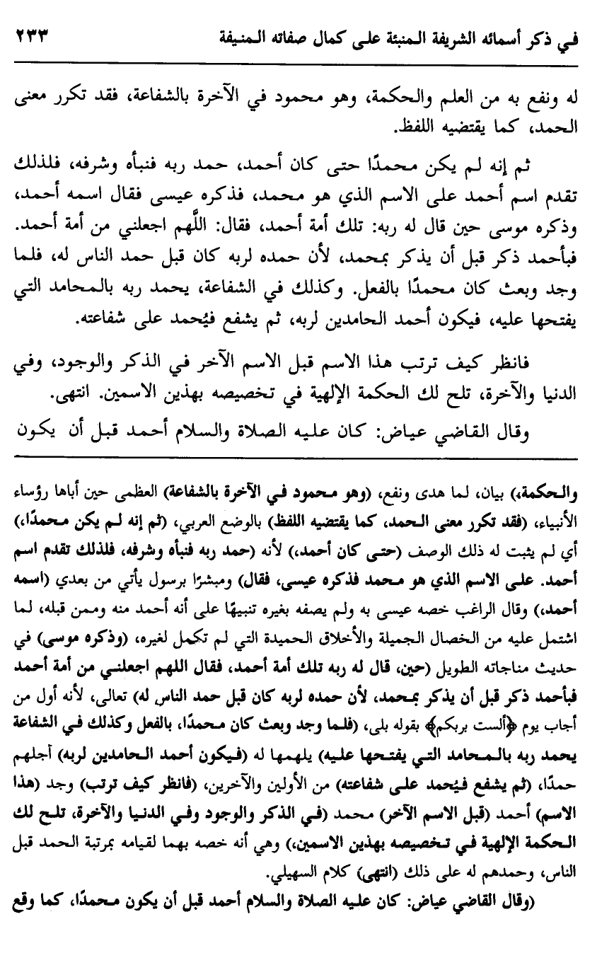"وقال القاضي عياض: كان عليه الصلاة والسلام أحمد قبل أن يكون محمدا، كما وقع