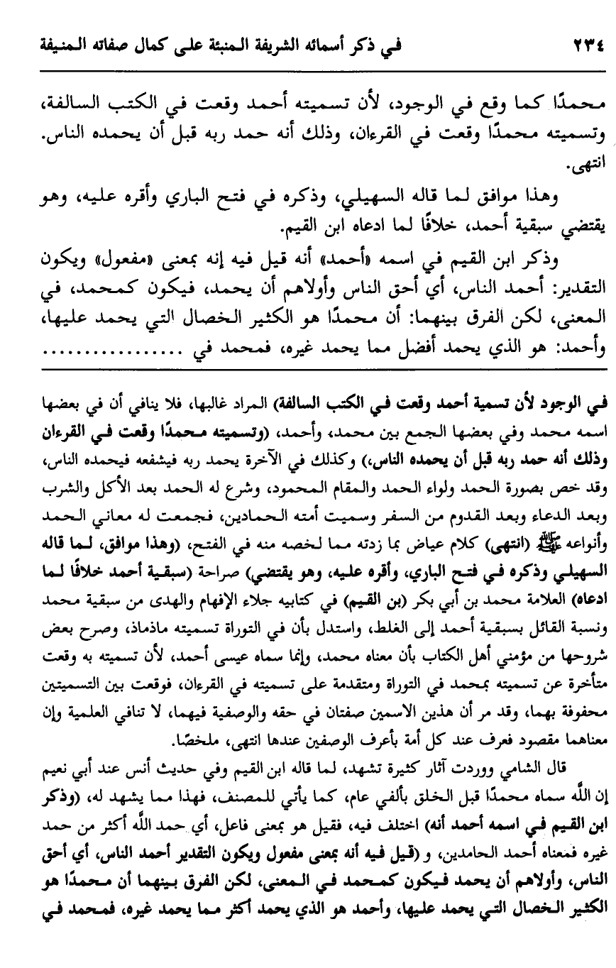 وذكر ابن القيم في اسمه "أحمد" أنه قيل فيه إنه بمعنى "مفعول" ويكون التقدير: أحمد الناس، أي أحق الناس وأولاهم أن يحمد، فيكون كمحمد، في المعنى، لكن الفرق بينهما: أن محمدا هو الكثير الخصال التي يحمد عليها، وأحمد: هو الذي يحمد أفضل مما يحمد غيره، فمحمد في
