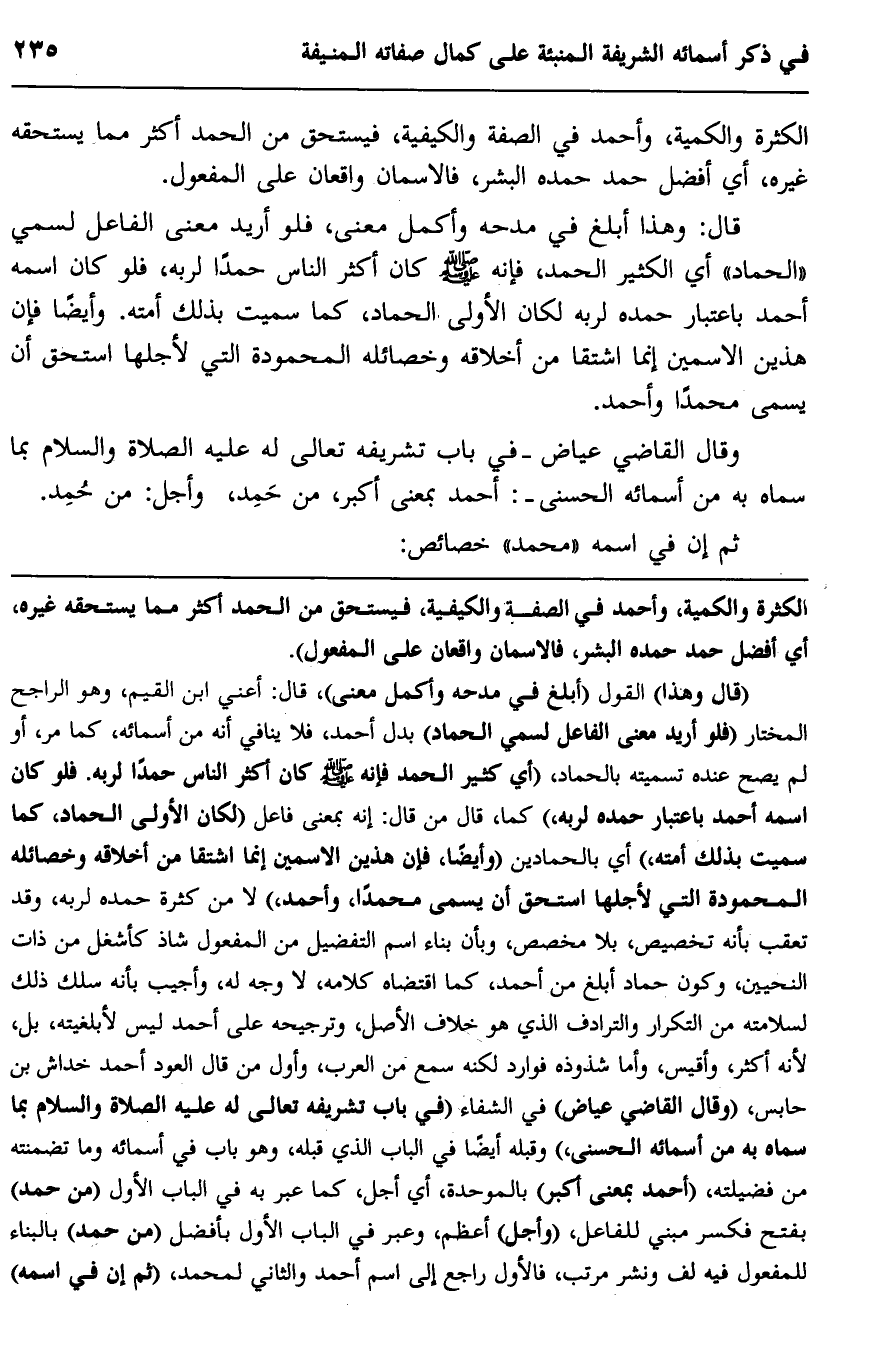 وقال القاضي عياض -في باب تشريفه تعالى له عليه الصلاة والسلام بما سماه به من أسماءه الحسنى- أحمد بمعنى أكبر، من حمد، وأجل: من حمد.