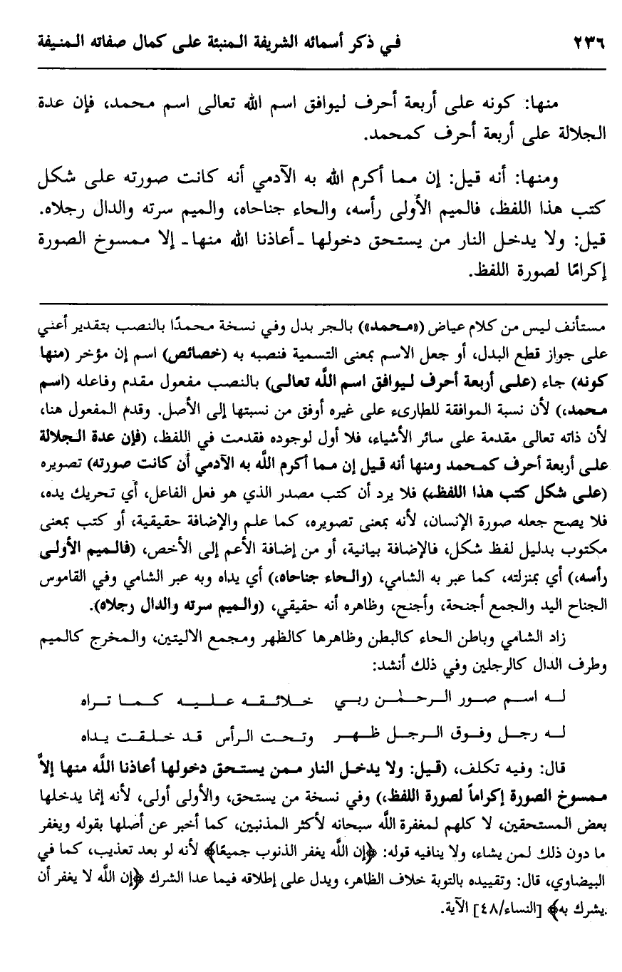 ومنها: أنه قيل: إن مما أكرم الله به الآدمي أنه كانت صورته على شكل كتب هذا اللفظ، فالميم الأولى رأسه، والحاء جناحاه، والميم سرته والدال رجلاه. قيل: ولا يدخل النار من يستحق دخولها -أعاذنا الله منها- إلا ممسوخ الصورة إكراما لصورة اللفظ.