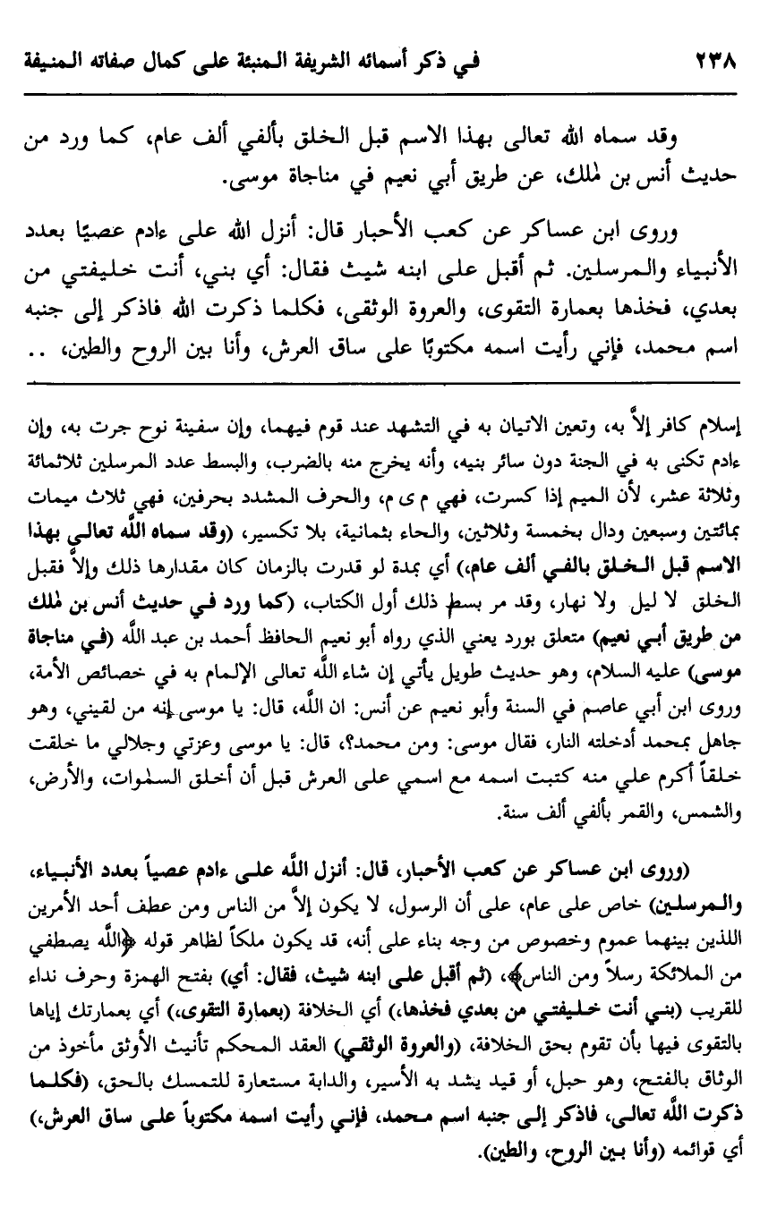 إسلام كافر إلا به، وتعين الإتيان به في التشهد عند قوم فيهما، وإن سفينة نوح جرت به، وإن آدم تكنى به في الجنة دون سائر بنيه، وأنه يخرج منه بالضرب، والبسط عدد المرسلين ثلاثمائة وثلاثة عشر؛ لأن الميم إذا كسرت فهي م ي م، والحرف المشدد بحرفين، فهي ثلاث ميمات بمائتين وسبعين ودال بخمسة وثلاثين، والحاء بثمانية، بلا تكسير، "وقد سماه الله تعالى بهذا الاسم قبل الخلق بألفي ألف عام"، أي بمدة لو قدرت بالزمان كان مقدارها ذلك وإلا فقبل الخلق لا ليل ولا نهار، وقد مر بسط ذلك أول الكتاب "كما ورد في حديث أنس بن مالك من طريق أي نعيم" متعلق بورد يعني الذي رواه أبو نعيم الحافظ أحمد بن عبد الله "في مناجاة موسى" عليه السلام، وهو حديث طويل يأتي إن شاء الله تعالى الإلمام به في خصائص الأمة، وروى ابن أبي عاصم في السنة وأبو نعيم عن أنس: إن الله، قال: يا موسى إنه من لقيني، وهو جاهل بمحمد أدخلته النار، فقال موسى: ومن محمد؟ قال: يا موسى وعزتي وجلالي ما خلقت خلقا أكرم عليَّ منه كتبت اسمه مع اسمي على العرش قبل أن أخلق السماوات والأرض، والشمس، والقمر بألفي ألف سنة.