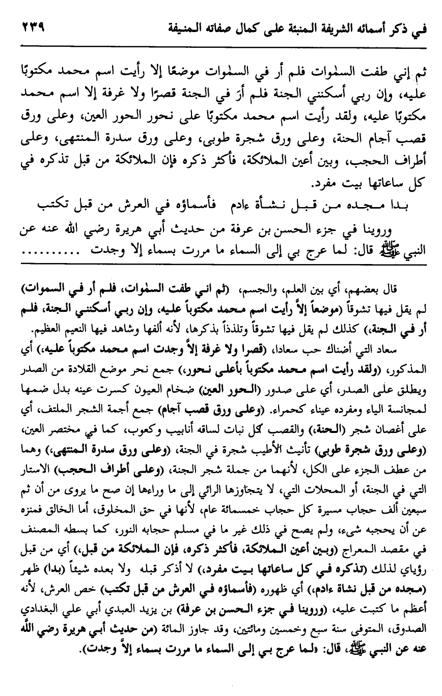 ثم إني طفت السماوات فلم أر في السماوات موضعا إلا رأيت اسم محمد مكتوبا عليه، وإن ربي أسكنني الجنة فلم أر في الجنة قصرا ولا غرفة إلا اسم محمد مكتوبا عليه، ولقد رأيت اسم محمد مكتوبا على نحور الحور العين، وعلى ورق قصب آجام الحنة، وعلى ورق شجرة طوبى، وعلى ورق سدرة المنتهى، وعلى أطراف الحجب، وبين أعين الملائكة فأكثر ذكره فإن الملائكة من قبل تذكره في كل ساعاتها بيت مفرد.