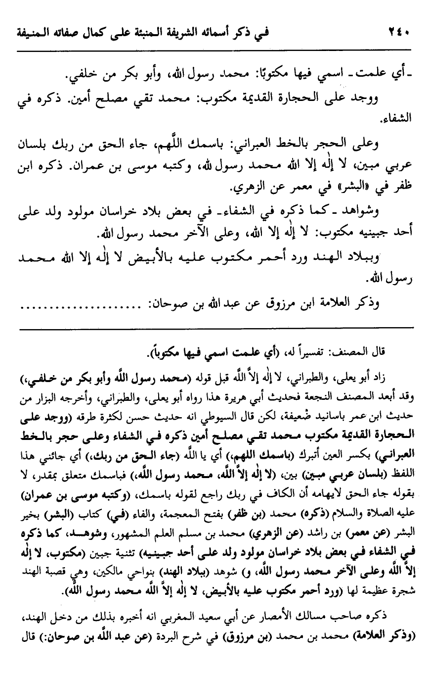 زاد أبو يعلي، والطبراني، لا إله إلا الله قبل قوله "محمد رسول الله وأبو بكر من خلفي" وقد أبعد المصنف النجعة فحديث أبي هريرة هذا رواه أبو يعلى، والطبراني، وأخرجه البزار من حديث ابن عمر بأسانيد ضعيفة، لكن قال السيوطي أنه حديث حسن لكثرة طرقه "ووجد على الحجارة القديمة مكتوب محمد تقي مصلح أمين ذكره في الشفاء وعلى حجر بالخط العبراني" بكسر العين أتبرك "باسمك اللهم"، أي يا الله "جاء الحق من ربك " أي جائني هذا اللفظ "بلسان عربي مبين" بين، "لا إله إلا الله، محمد رسول الله" فباسمك متعلق بمقدر، لا يقول جاء الحق لإيهامه أن الكاف في ربك راجع لقوله باسمك، "وكتبه موسى بن عمران" عليه الصلاة والسلام "ذكره" محمد "بن ظفر" بفتح المعجمة والفاء "في" كتاب "البشر" بخير البشر "عن معمر" بن راشد "عن الزهري" محمد بن مسلم العلم المشهور، "وشواهد، كما ذكره في الشفاء في بعض بلاد خراسان مولود ولد على أحد جبينيه" تثنية جبين "مكتوب، لا إله إلا الله وعلى الآخر محمد رسول الله، و" شوهد "ببلاد الهند" بنواحي مالكين، وهي قصبة الهند شجرة عظيمة لها "ورد أحمر مكتوب عليه بالأبيض، لا إله إلا الله محمد رسول الله".