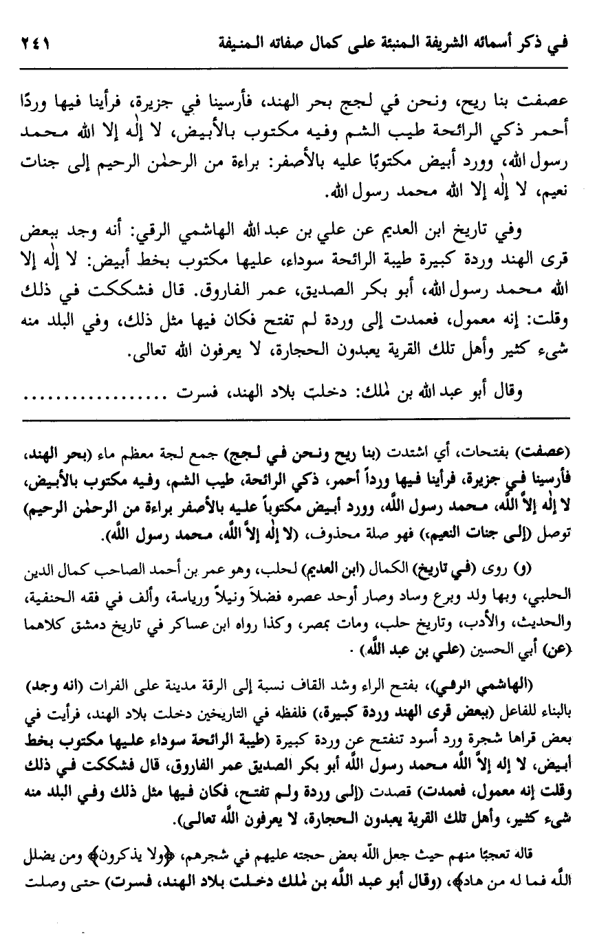 "عصفت" بفتحات، أي اشتدت "بنا ريح ونحن في لجج" جمع لجة معظم ماء "بحر الهند، فأرسينا في جزيرة، فرأينا فيها وردا أحمر، ذكي الرائحة، طيب الشم، وفيه مكتوب بالأبيض، لا إله إلا الله محمد رسول الله، وورد أبيض مكتوبا عليه بالأصفر براءة من الرحمن الرحيم" توصل "إلى جنات النعيم" فهو صلة محذوف، "لا إله إلا الله، محمد رسول الله".