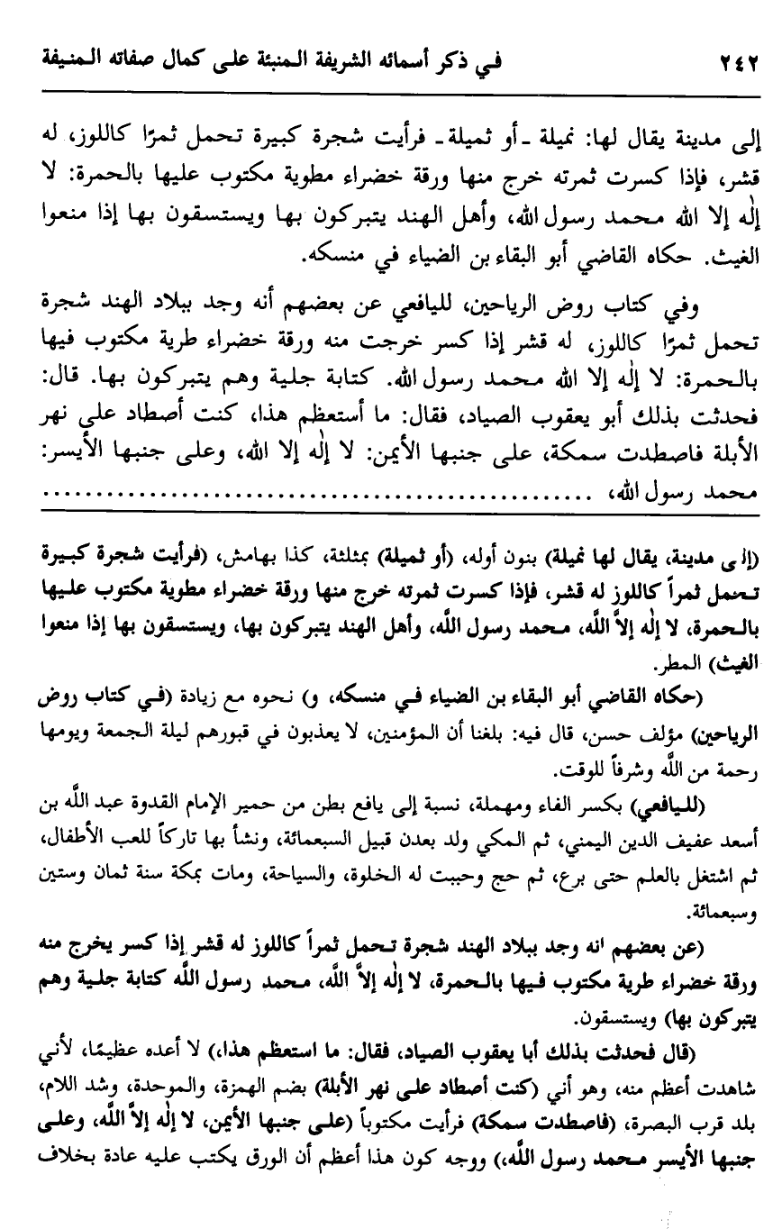 وفي كتاب روض الرياحين، لليافعي عن بعضهم أنه وجد ببلاد الهند شجرة تحمل ثمرا كاللوز، له قشر إذا كسر خرجت منه ورقة خضراء طرية مكتوب فيها بالحمرة: لا إله إلا الله محمد رسول الله. كتابة جلية وهم يتبركون بها. قال: فحدثت بذلك أبو يعقوب الصياد، فقال: ما استعظم هذا، كنت أصطاد على نهر الأبلة فاصطدت سمكة، على جنبها الأيمن: لا إله إلا الله، وعلى جنبها الأيسر: محمد رسول الله،