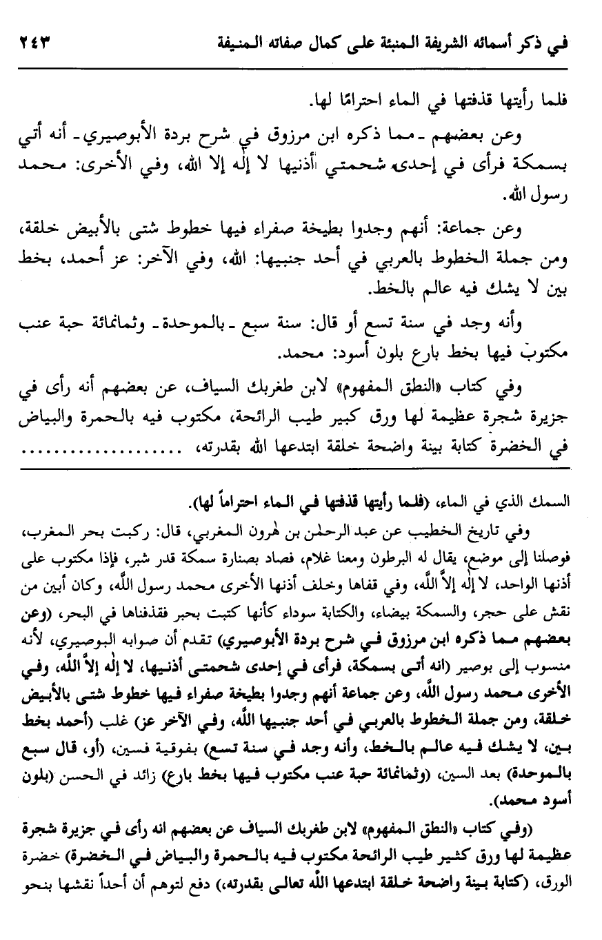 وعن بعضهم -مما ذكره ابن مرزوق في شرح بردة الأبوصيري- أنه أتى بسمكة فرأى في إحدى شحمتي أذنيها لا إله إلا الله وفي الأخرى: محمد رسول الله.
