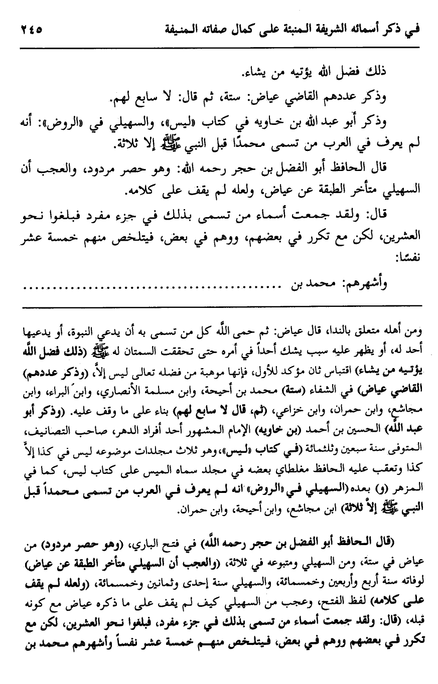 "قال الحافظ أبو الفضل بن حجر رحمه الله" في فتح الباري، "وهو حصر مردود" من عياض في ستة، ومن السهيلي ومتبوعه في ثلاثة، "والعجب أن السهيلي متأخر الطبقة عن عياض" لوفاته سنة أربع وأربعين وخمسمائة، والسهيلي سنة إحدى وثمانين وخمسمائة، "ولعله لم يقف على كلامه" لفظ الفتح، وعجب من السهيلي كيف لم يقف على ما ذكره عياض مع كونه قبله، "قال: ولقد جمعت أسماء من تسمى بذلك في جزء مفرد، فبلغوا نحو العشرين، لكن مع تكرر في بعضهم ووهم في بعض، فيتلخص منهم خمسة عشر نفسا وأشهرهم محمد بن