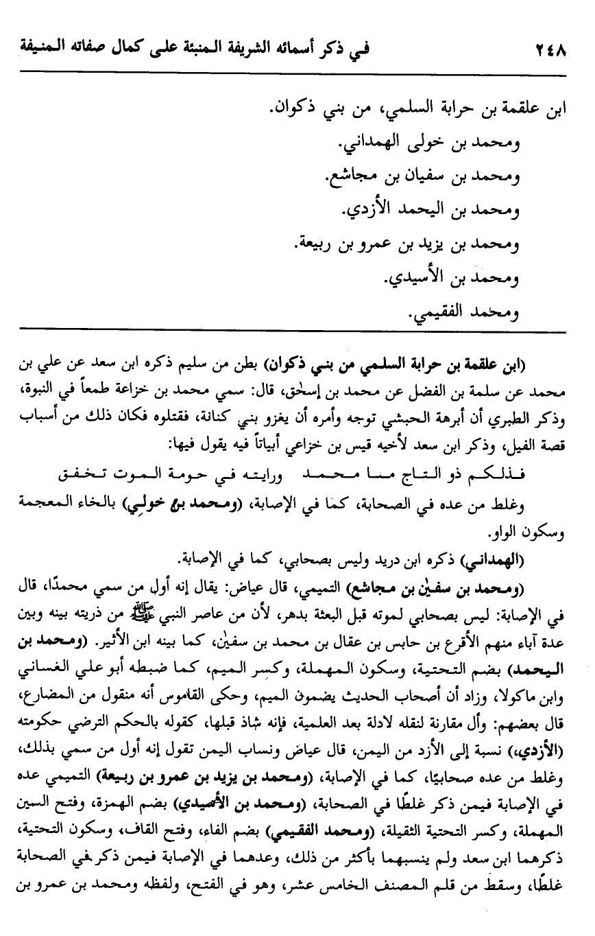 "ومحمد بن سفيان بن مجاشع" التميمي، قال عياض: يقال إنه أول من سمي محمدا، قال في الإصابة: ليس بصحابي لموته قبل البعثة بدهر؛ لأن من عاصر النبي صلى الله عليه وسلم من ذريته بينه وبين عدة آباء منهم الأقرع بن حابس بن عقال بن محمد بن سفيان، كما بينه ابن الأثير. "ومحمد بن اليحمد" بضم التحتية وسكون المهملة وكسر الميم، كما ضبطه أبو علي الغساني وابن ماكولا، وزاد أن أصحاب الحديث يضمون الميم، وحكى القاموس أنه منقول من المضارع قال بعضهم: وأل مقارنة لنقله لأدلة بعد العلمية فإنه شاذ قبلها، كقوله بالحكم الترضي حكومته "الأزدي" نسبة إلى الأزد من اليمن، قال عياض ونساب اليمن تقول إنه أول من سمي بذلك، وغلط من عده صحابيا، كما في الإصابة، "ومحمد بن يزيد بن عمرو بن ربيعة" التميمي عده في الإصابة فيمن ذكره غلطا في الصحابة، "ومحمد بن الأسيدي" بضم الهمزة، وفتح السين المهملة، وكسر التحتية الثقيلة، "ومحمد الفقيمي" بضم الفاء، وفتح القاف، وسكون التحتية، ذكرهما ابن سعد ولم ينسبهما بأكثر من ذلك، وعدهما في الإصابة فيمن ذكر في الصحابة غلطا، وسقط من قلم المصنف الخامس عشر، وهو في الفتح، ولفظه ومحمد بن عمرو بن