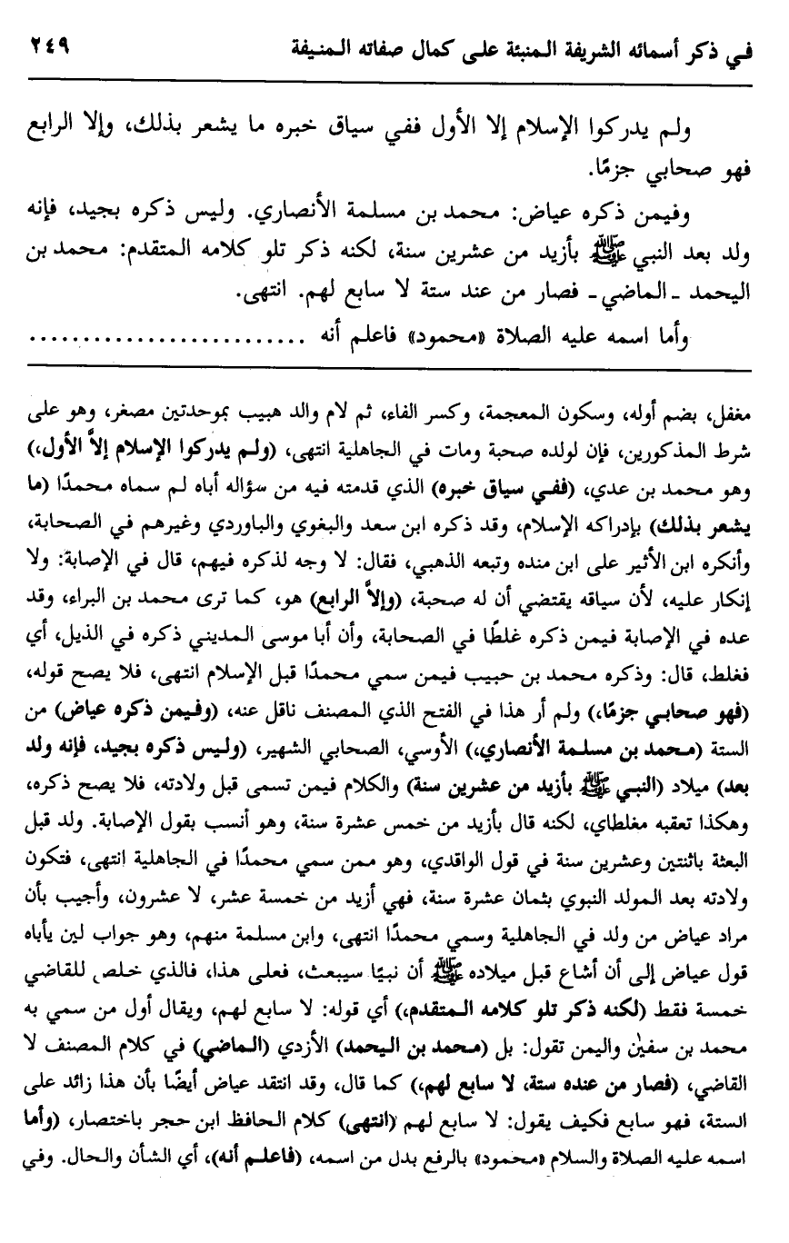 وفيمن ذكره عياض: محمد بن مسلمة الأنصاري، وليس ذكره بجيد، فإنه ولد بعد النبي صلى الله عليه وسلم بأزيد من عشرين سنة، لكنه ذكر تلو كلامه المتقدم، محمد بن اليحمد، الماضي فصار من عند ستة لا سابع لهم، انتهى.