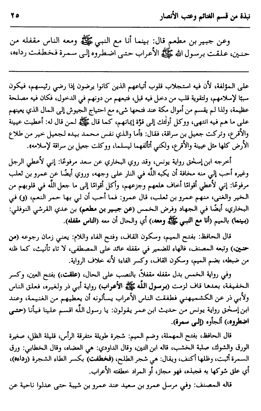 أخرجه ابن إسحاق رواية يونس، وقد روى البخاري عن سعد مرفوعا: "إني لأعطي الرجل وغيره أحب إلي منه مخافة أن يكبه الله في النار على وجهه" وروي أيضا عن عمرو بن ثعلب مرفوعا: "إني لأعطى أقواما أخاف هلعهم وجزعهم، وأكل أقواما إلى ما جعل الله في قلوبهم من الخير والغنى، منهم عمرو بن ثعلب"، قال عمرو: فما أحب أن لي بها حمر النعم، "و" في البخاري، أيضا في الجهاد وفرض الخمس "عن جبير بن مطعم" بن عدي القرشي النوفلي": "بينما" بالميم أنا مع النبي صلى الله عليه وسلم ومعه" أي والحال أن معه "الناس مقفله".