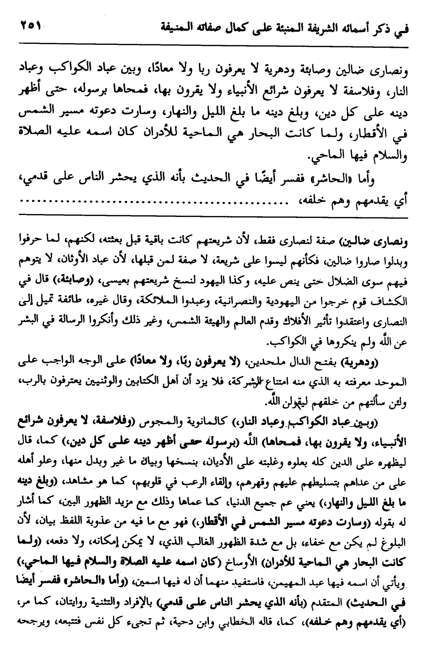 ونصارى ضالين وصابئة ودهرية لا يعرفون ربا ولا معادا، وبين عباد الكواكب وعباد النار، وفلاسفة لا يعرفون شرائع الأنبياء ولا يقرون بها، فمحاها برسوله، حتى أظهر دينه على كل دين، وبلغ دينه ما بلغ الليل والنهار، وسارت دعوته مسير الشمس في الأقطار، ولما كانت البحار هي الماحية للأدران كان اسمه عليه الصلاة والسلام فيها الماحي.