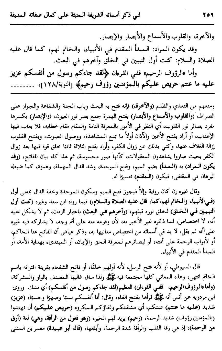 قال السيوطي، أو لأنه فتح الرسل؛ لأنه أولهم خلقا، أو فاتح الشفعاء بقرينة اقترانه باسم الخاتم انتهى، وهذه المعاني كلها مجتمعة فيه صلى الله عليه وسلم ولذا ساق غالبها المصنف بالواو والمشركة، "وأما الرءوف الرحيم ففي القرآن" العظيم "لقد جاءكم رسول من أنفسكم" أي منك، وروى ابن مردويه عن أنس أنه صلى الله عليه وسلم قرأها بفتح الفاء، وقال: "أنا أنفسكم نسبا وصهرا وحسبا"، "عزيز" شديد "عليه ما عنتم" عنتكم، أي مشقتكم ولقاؤكم المكروه "حريص عليكم" أن تهتدوا "بالمؤمنين رءوف" شديد الرحمة "رحيم" يريد لهم الخير، وهو "فعول من الرأفة، وهي" لغة "أرق من الرحمة" إذ هي رقة القلب والرأفة شدة الرحمة، وأبلغها، "قاله أبو عبيدة" معمر بن المثنى