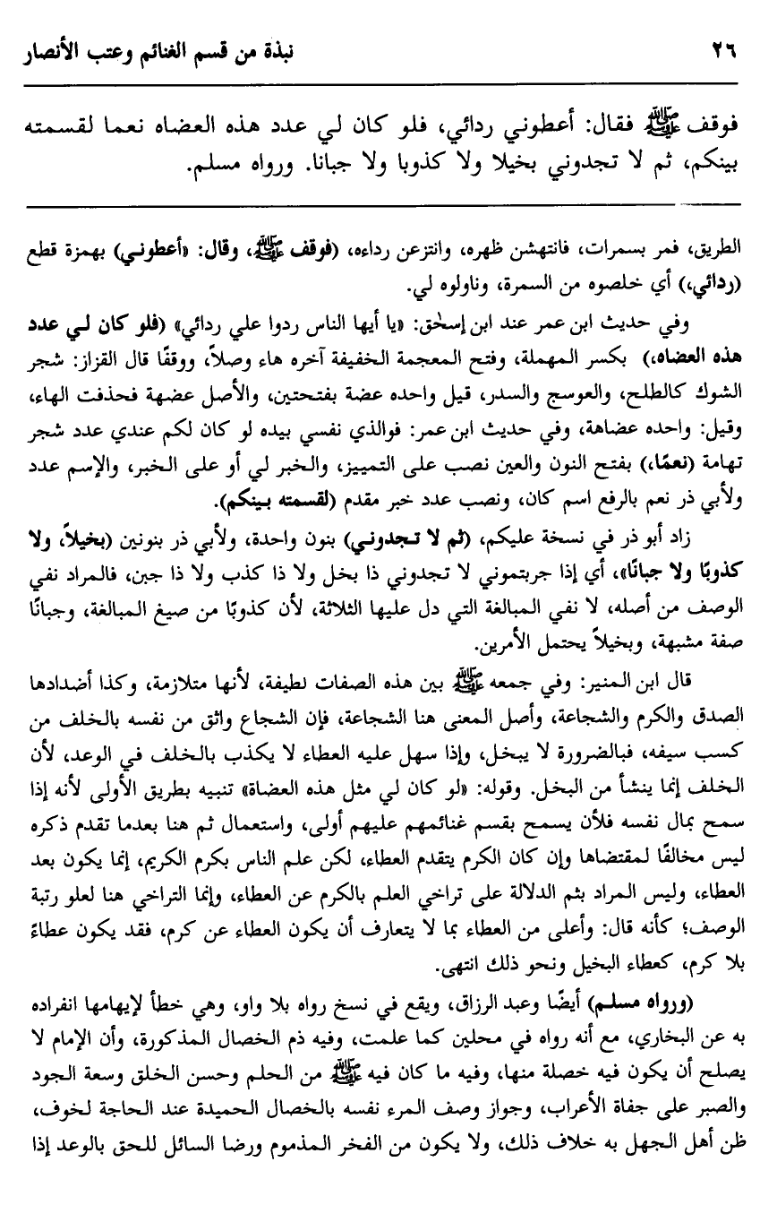 فوقف صلى الله عليه وسلم: فقال: "أعطوني ردائي، فلو كان لي عدد هذه العضاه نعما لقسمته بينكم، ثم لا تجدوني بخيلا ولا كذوبا ولا جبانا"، ورواه مسلم.