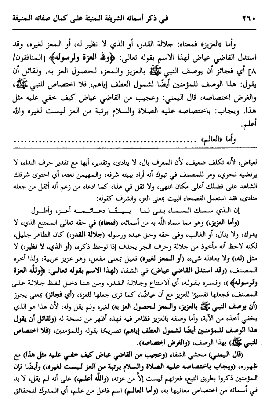 "قال اليمني" محشي الشفاء "وعجيب من القاضي عياض كيف خفي عليه مثل هذا" مع ظهوره، "ويجاب باختصاصه عليه الصلاة والسلام برتبة من العز ليست لغيره" وأيضا فإن المؤمنين ذكروا بطريق التبع، فعزتهم ليست إلا من عزته، "والله أعلم" على أنه لم يقل، لا بد في أسمائه من اختصاص معانيها به، "وأما العالم" اسم فاعل من علم أي المدرك للحقائق