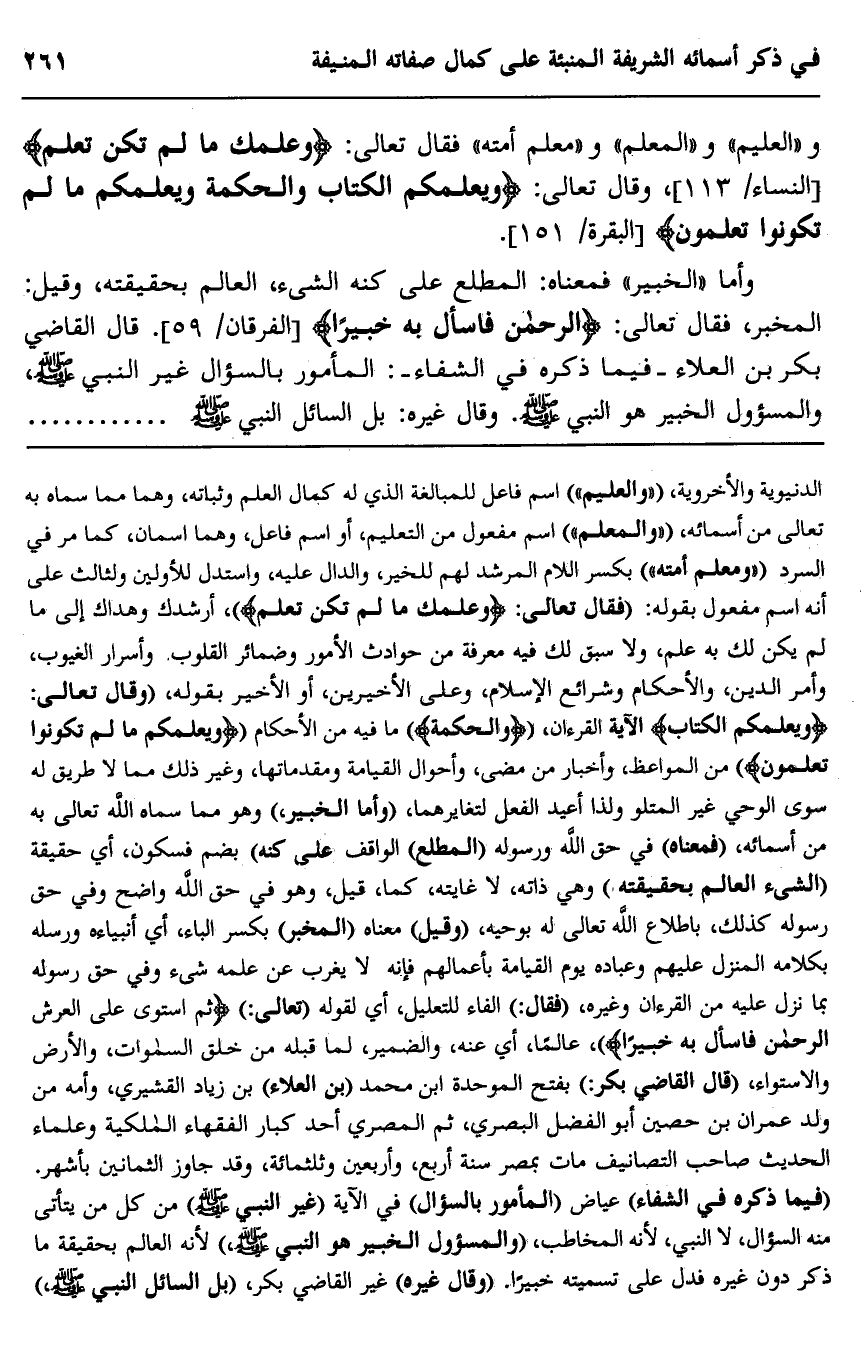 و"العليم" و"المعلم" و"معلم أمته" فقال تعالى: {وَعَلَّمَكَ مَا لَمْ تَكُنْ تَعْلَمُ} [النساء: 113] ، وقال تعالى: {وَيُعَلِّمُكُمُ الْكِتَابَ وَالْحِكْمَةَ وَيُعَلِّمُكُمْ مَا لَمْ تَكُونُوا تَعْلَمُونَ} [البقرة: 151] .