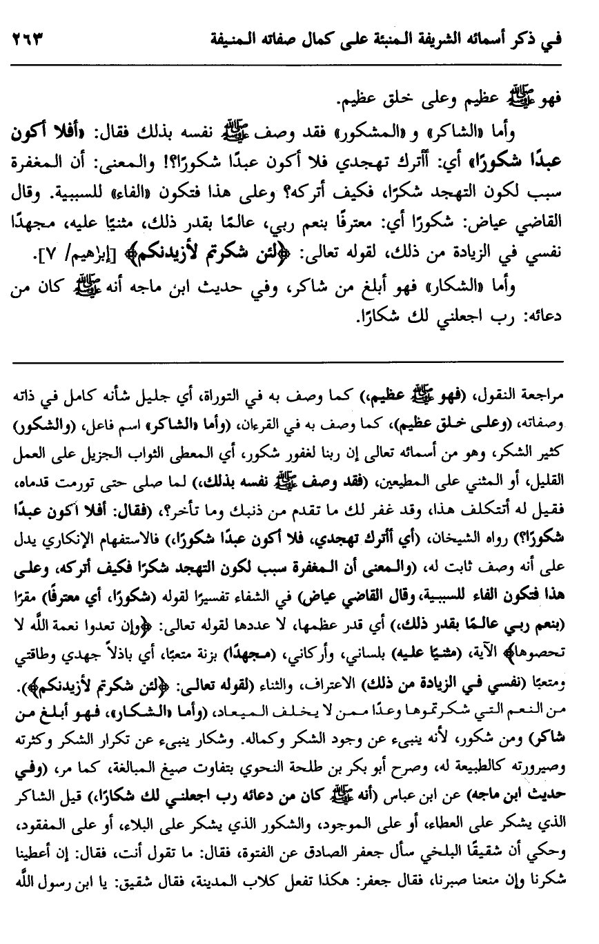 مراجعة النقول، "فهو صلى الله عليه وسلم عظيم" كما وصف به في التوراة أي جليل شأنه كامل في ذاته وصفاته، وعلى خلق عظيم" كما وصف به في القرآن، "وأما "الشاكر" اسم فاعل، "والشكور" كثير الشكر، وهو من أسمائه تعالى إن ربنا لغفور شكور، أي المعطي الثواب الجزيل على العمل القليل، أو المثني على المطيعين، "فقد وصف صلى الله عليه وسلم نفسه بذلك"، لما صلى حتى تورمت قدماه فقيل له، أتتكلف هذا، وقد غفر لك ما تقدم من ذنبك وما تأخر؟ "فقال: "أفلا أكون عبدا شكورا"؟ رواه الشيخان، "أي أأترك تهجدي فلا أكون عبدا شكورا" فالاستفهام الإنكاري يدل على أنه وصف ثابت له، "والمعنى أن المغفرة سبب لكون التهجد شكرا فكيف أتركه، وعلى هذا فتكون الفاء للسببية، وقال القاضي عياض في الشفاء تفسيرا لقوله "شكورا، أي معترفا" مقرا "بنعم ربي عالما بقدر ذلك"، أي قدر عظمها، لا عددها لقوله تعالى: {وَإِنْ تَعُدُّوا نِعْمَةَ اللَّهِ لَا تُحْصُوهَا} الآية، "مثنيا عليه" بلساني، وأركاني، "مجهدا" بزنة متعبا، أي باذلا جهدي وطاقاتي ومتعبا "نفسي في الزيادة من ذلك"، الاعتراف والثناء "لقوله تعالى: {لَئِنْ شَكَرْتُمْ لَأَزِيدَنَّكُمْ} " من النعم التي شكرتموها وعدا ممن لا يخلف الميعاد، "وأما "الشكار" فهو أبلغ من شاكر" ومن شكور؛ لأنه ينبيء عن وجود الشكر وكماله. وشكار ينبئ عن تكرار الشكر وكثرته وصيرورته كالطبيعة له، وصرح أبو بكر بن طلحة النحوي بتفاوت صيغ المبالغة، كما مر، "وفي حديث ابن ماجه" عن ابن عباس أنه صلى الله عليه وسلم كان من دعائه "رب اجعلني لك شكارا" قيل الشاكر الذي يشكر على العطاء، أو على الموجود والشكور الذي يشكر على البلاء، أو على المفقود، وحكي أن شقيقا البلخي سأل جعفر الصادق عن الفتوة، فقال: ما تقول أنت، فقال: إن أعطينا شكرنا وإن منعنا صبرنا، فقال جعفر: هكذا تفعل كلاب المدينة، فقال شقيق: يابن رسول الله