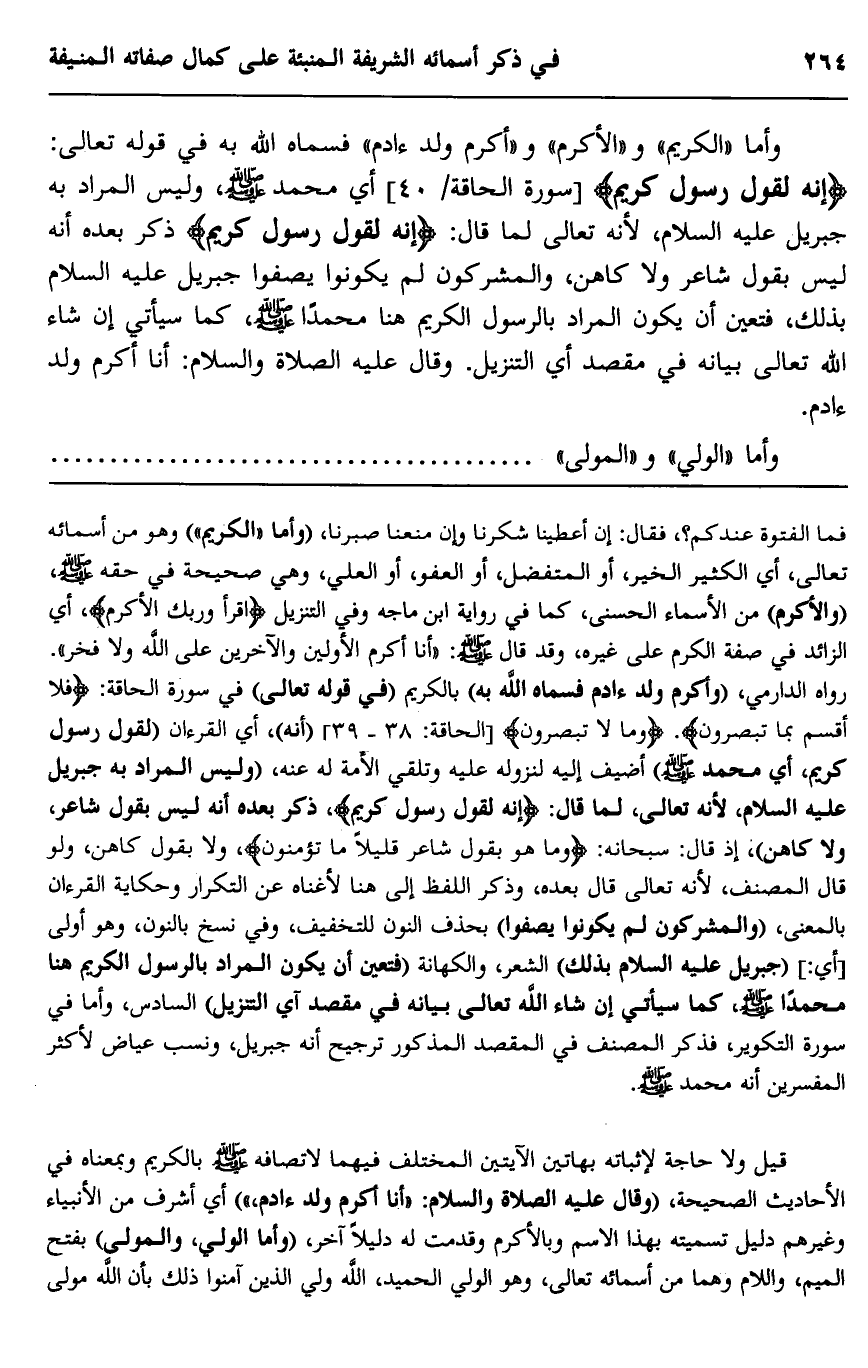 قيل ولا حاجة لإثباته بهاتين الآيتين المختلف فيهما لاتصافه صلى الله عليه وسلم بالكريم وبمعناه في الأحاديث الصحيحة، "وقال عليه الصلاة والسلام: "أنا أكرم ولد آدم" أي أشرف من الأنبياء وغيرهم دليل تسميته بهذا الاسم وبالأكرم وقدمت له دليلا آخر، "وأما الوالي، والمولى" بفتح الميم، واللام وهما من أسمائه تعالى، وهو الولي الحميد، الله ولي الذين آمنوا ذلك بأن الله مولى