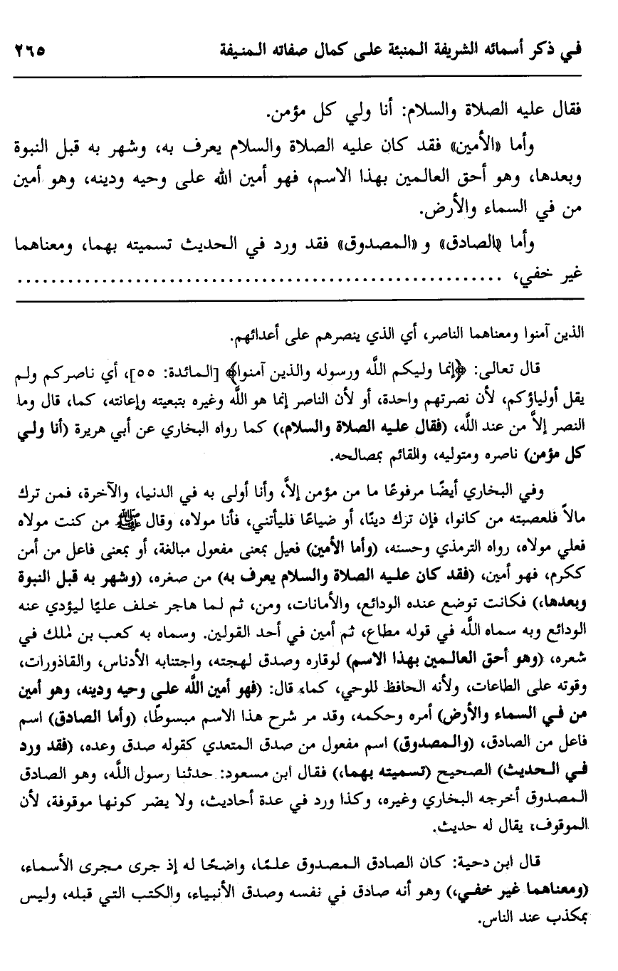 وفي البخاري أيضا مرفوعا "ما من مؤمن إلا وأنا أولى به في الدنيا، والآخرة، فمن ترك مالا فلعصبته من كانوا، فإن ترك دينا، أو ضياعا فليأتني، فأنا مولاه"، وقال صلى الله عليه وسلم: "من كنت مولاه فعلي مولاه"، رواه الترمذي وحسنه "وأما الأمين" فعيل بمعنى مفعول مبالغة، أو بمعنى فاعل من أمن ككرم، فهو أمين "فقد كان عليه الصلاة والسلام يعرف به" من صغره، "وشهر به قبل النبوة وبعدها" فكانت توضع عنده الودائع، والأمانات، ومن ثم لما هاجر خلف عليا ليؤدي عنه الودائع وبه سماه الله في قوله مطاع، ثم أمين في أحد القولين. وسماه به كعب بن مالك في شعره، "وهو أحق العالمين بهذا الاسم" لوقاره وصدق لهجته، واجتنابه الأدناس، والقاذورات، وقوته على الطاعات، ولأنه الحافظ للوحي، كما قال: "فهو أمين الله على وحيه ودينه، وهو أمين من في السماء والأرض" أمره وحكمه، وقد مر شرح هذا الاسم مبسوطا، "وأما الصادق" اسم فاعل من الصادق، "والمصدوق" اسم مفعول من صدق المتعدي كقوله صادق وعده، "فقد ورد في الحديث" الصحيح "تسميته بهما" فقال ابن مسعود، حدثنا رسول الله، وهو الصادق المصدوق أخرجه البخاري وغيره، وكذا ورد في عدة أحاديث، ولا يضر كونها موقوفة؛ لأن الموقوف يقال له حديث.