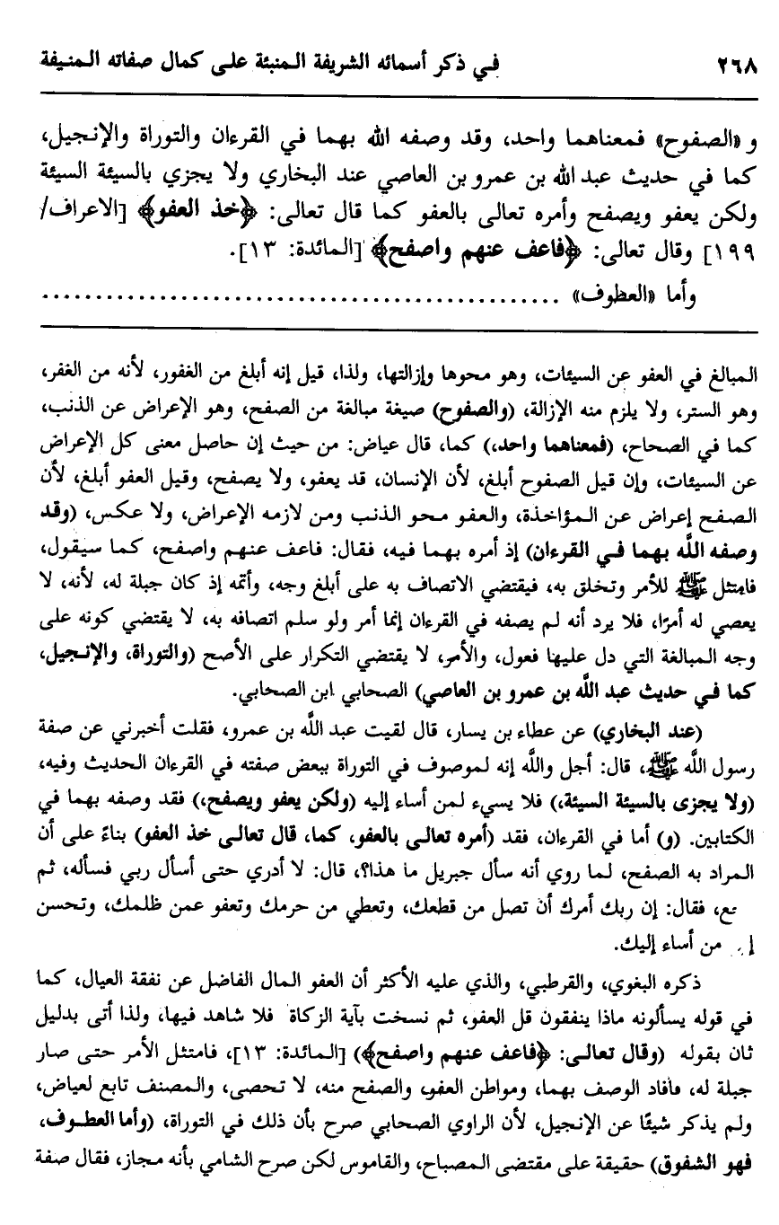 ذكره البغوي، والقرطبي، والذي عليه الأكثر أن العفو المال الفاضل عن نفقة العيال، كما في قوله: {وَيَسْأَلونَكَ مَاذَا يُنْفِقُونَ قُلِ الْعَفْوَ} ، ثم نسخت بآية الزكاة فلا شاهد فيها، ولذا أتى بدليل ثان بقوله: وقال تعالى: {فَاعْفُ عَنْهُمْ وَاصْفَحْ} [المائدة: 13] ، فامتثل الأمر حتى صار جبلة له، فأفاد الوصف بهما، ومواطن العفو، والصفح منه، لا تحصى، والمصنف تابع لعياض، ولم يذكر شيئا عن الإنجيل؛ لأن الراوي الصحابي صرح بأن ذلك في التوراة، "وأما العطوف، فهو الشفوق" حقيقة على مقتضى المصباح، والقاموس لكن صرح الشامي بأنه مجاز، فقال صفة