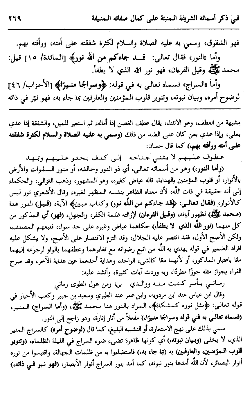 وأما "السراج" فسماه تعالى به في قوله: {وَسِرَاجًا مُنِيرًا} [الأحزاب: 46] لوضوح أمره، وبيان نبوته، وتنوير قلوب المؤمنين والعارفين بما جاء به، فهو نير في ذاته.