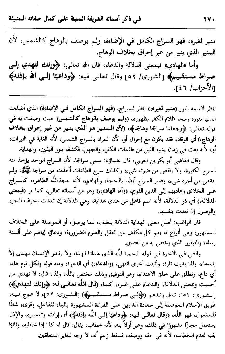 وقال القاضي أبو بكر بن العربي، قال علماؤنا: سمي سراجا؛ لأن السراج الواحد يؤخذ منه السرج الكثيرة، ولا ينقص من ضوئه شيء، وكذلك سرج الطاعات أخذت من سراجه صلى الله عليه وسلم ولم ينقص من أجره شيء وفسر السراج أيضا بالحجة، والهادي؛ لأنه حجة الله الظاهرة، كالسراج على الخلائق وهاديهم إلى الدين القويم، "وأما الهادي" وهو من أسمائه تعالى كما مر فبمعنى الدلالة، أي ذو الدلالة؛ لأنه اسم فاعل من هدى هداية، وهي الدلالة إن تعدت بحرف الجر، والوصول إن تعدت بنفسها.