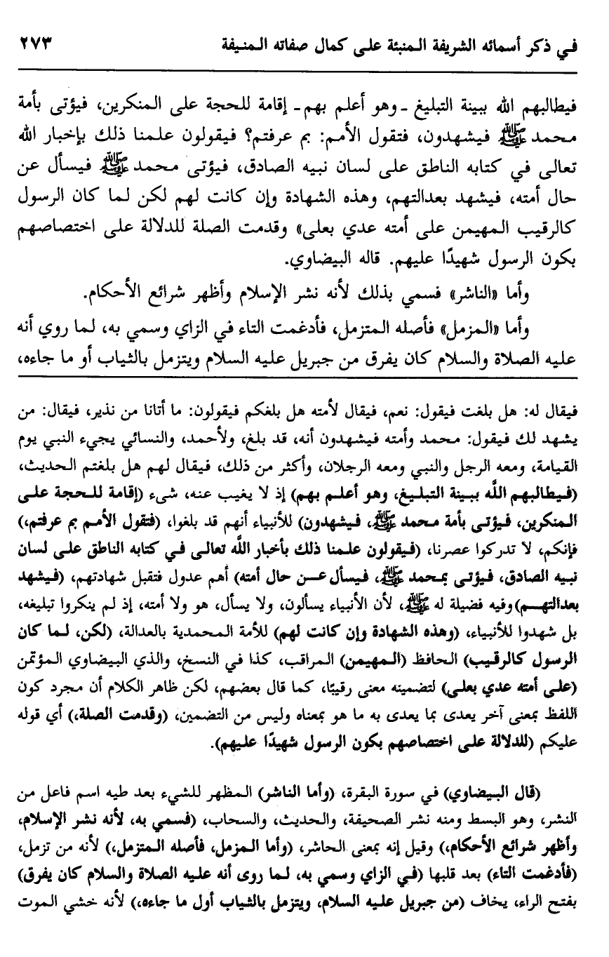 "قال البيضاوي" في سورة البقرة، "وأما الناشر" المظهر للشيء بعد طيه اسم فاعل من النشر، وهو البسط ومنه نشر الصحيفة، والحديث، والسحاب، "فسمي به؛ لأنه نشر الإسلام، وأظهر شرائع الأحكام" وقيل إنه بمعنى الحاشر، "وأما المزمل، فأصله المتزمل" لأنه من تزمل، "فأدغمت التاء" بعد قلبها "في الزاي وسمي به لما روى أنه عليه الصلاة والسلام كان يفرق" بفتح الراء، يخاف من جبريل عليه السلام، ويتزمل بالثياب أول ما جاءه" لأنه خشي الموت