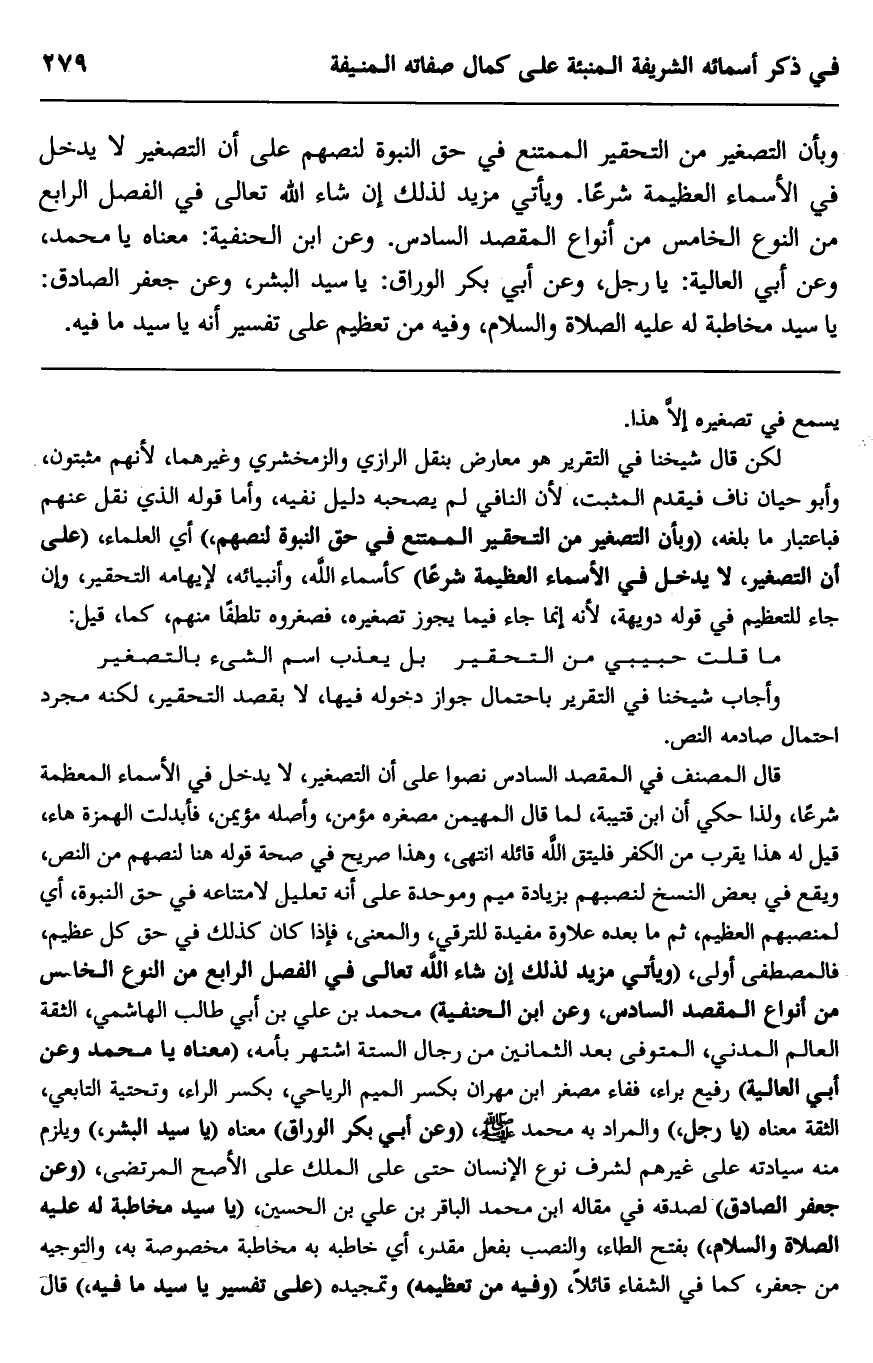 قال المصنف في المقصد السادس نصوا على أن التصغير لا يدخل في الأسماء المعظمة شرعا، ولذا حكي أن ابن قتيبة، لما قال المهيمن مصغره مؤمن، وأصله مؤيمن، فأبدلت الهمزة هاء، قيل له هذا يقرب من الكفر فليتق الله قائله انتهى، وهذا صريح في صحة قوله هنا لنصهم من النص، ويقع في بعض النسخ لنصبهم بزيادة ميم وموحدة على أنه تعليل لامتناعه في حق النبوة، أي لمنصبهم العظيم، ثم ما بعده علاوة مفيدة للترقي، والمعنى فإذا كان كذلك في حق كل عظيم فالمصطفى أولى، "ويأتي مزيد لذلك إن شاء الله تعالى في الفصل الرابع من النوع الخامس من أنواع المقصد السادس، وعن ابن الحنفية" محمد بن علي بن أبي طالب الهاشمي، الثقة العالم المدني، المتوفى بعد الثمانين من رجال الستة اشتهر بأمه، "معناه يا محمد وعن أبي العالية" رفيع براء، ففاء مصغر ابن مهران بكسر الميم الرياحي، بكسر الراء، وتحتية التابعي الثقة معناه "يا رجل" والمراد به محمد صلى الله عليه وسلم، "وعن أبي بكر الوراق" معناه "يا سيد البشر" ويلزم منه سيادته على غيرهم لشرف نوع الإنسان حتى على الملك على الأصح المرتضى، وعن جعفر الصادق، لصدقه في مقاله ابن محمد الباقر بن علي بن الحسين، "يا سيد مخاطبة له عليه الصلاة والسلام" بفتح الطاء، والنصب بفعل مقدر، أي خاطبه به مخاطبة مخصوصة به، والتوجيه من جعفر، كما في الشفاء قائلا، "وفيه من تعظيمه" وتمجيده "على تفسير يا سيد ما فيه" قال