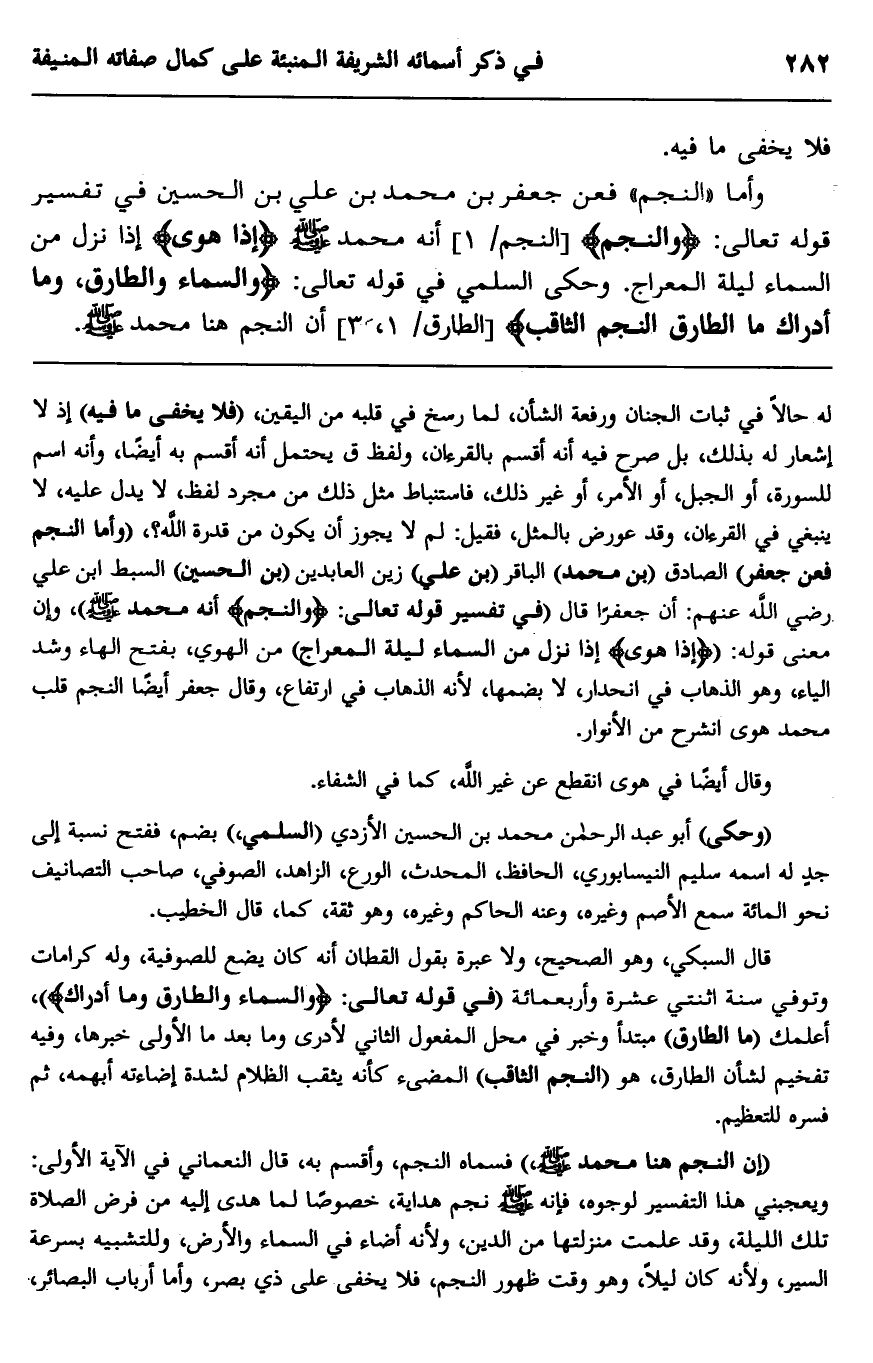 وأما "النجم" فعن جعفر بن محمد بن علي بن الحسن في تفسير قوله تعالى: {وَالنَّجْمِ} [النجم: 1] أنه محمد صلى الله عليه وسلم {إِذَا هَوَى} إذا نزل من السماء ليلة المعراج، وحكى السلمي قوله تعالى: {وَالسَّمَاءِ وَالطَّارِقِ، وَمَا أَدْرَاكَ مَا الطَّارِقُ، النَّجْمُ الثَّاقِبُ} [الطارق: 1-3] أن النجم هنا محمد صلى الله عليه.