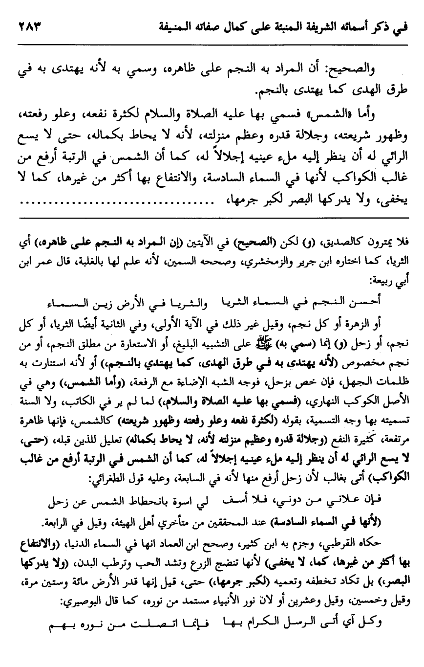 أو الزهرة أو كل نجم، وقيل غير ذلك في الآية الأولى، وفي الثانية أيضا الثريا، أو كل نجم، أو زحل "و" إنما "سمي به" صلى الله عليه وسلم على التشبيه البليغ، أو الاستعارة من مطلق النجم، أو من نجم مخصوص "لأنه يهتدى به في طريق الهدى، كما يهتدى بالنجم" أو لأنه استنارت به ظلمات الجهل، فإن خص بزحل فوجه الشبه الإضاءة مع الرفعة، وأما الشمس، وهي في الأصل كوكب النهاري، "فسمي بها عليه الصلاة واللام" لما لم ير في الكاتب، ولا السنة تسميته بها وجه التسمية، بقوله: "لكثرة نفعه وعلو رفعته وظهور شريعته" كالشمس، فإنها ظاهرة مرتفعة كثيرة النفع، "وجلالة" قدره وعظم منزلته لأنه لا يحاط بكماله" تعليل للذين قبله، "حتى، لا يسع الرائي له أن ينظر إليه ملء عينيه إجلالا له، كما أن الشمس في الرتبة أرفع من غالب الكواكب" أتى بغالب لأن زحل أرفع منها لأنه في السابعة، وعليه قول الطغرائي: