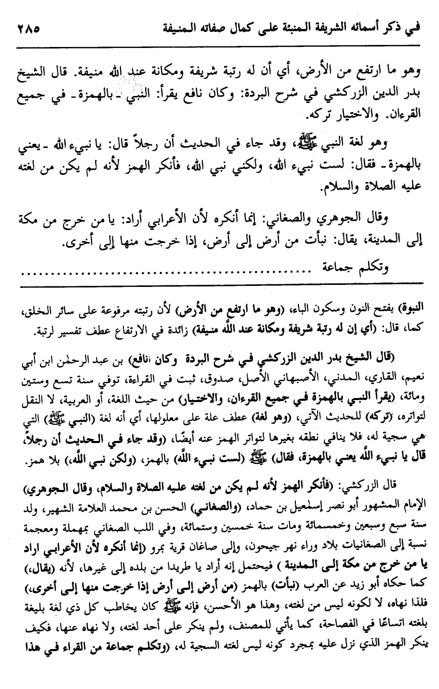 وهو ما ارتفع من الأرض، أي أنه لا له رتبة شريفة ومكانة عند الله منيفة. قال الشيخ بدر الدين الزركشي في شرح البردة: وكان نافع يقرأ، النبيء -بالهمزة- في جميع القرآن والاختيار تركه.