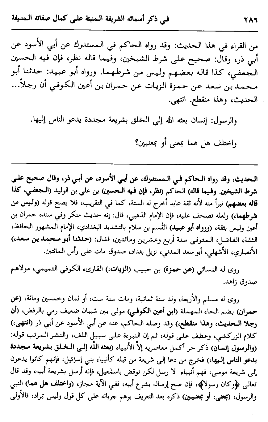 روى له مسلم والأربعة، ولد سنة ثمانية، ومات سنة ست، أو ثمان وخمسين ومائة، "عن حمران" بضم الحاء المهملة "ابن أعين الكوفي" مولى بين شيبان ضعيف رمي بالرفض، "أن رجلا الحديث، وهذا منقطع" وقد وصله الحاكم، عنه عن أبي الأسود عن أبي ذر "انتهى" كلام الزركشي، وعطف على قوله، ثم إن النبوءة على سبيل اللف، والنشر المرتب قوله: "والرسول إنسان" ذكر حر أكمل معاصريه إلا الأنبياء "بعثه الله إلى الخلق بشريعة مجددة يدعو الناس إليها" فخرج من دعا إلى شريعة من قبله كأنبياء بني إسرائيل، فإنهم كانوا يدعون إلى شريعة موسى، فهم أنبياء لا رسل لكن نوقض بإسماعيل فإنه أرسل بشريعة أبيه، وقد قال تعالى {وَكَانَ رَسُولًا} فإن صح إرساله بشرع أبيه، ففي الآية مجاز، "اختلف هل هما" النبي والرسول، "بمعنى، أبو بمعنيين" ذكره بعد التعيف بوهم جريانه على كل قول وليس بمراد، فالأولى