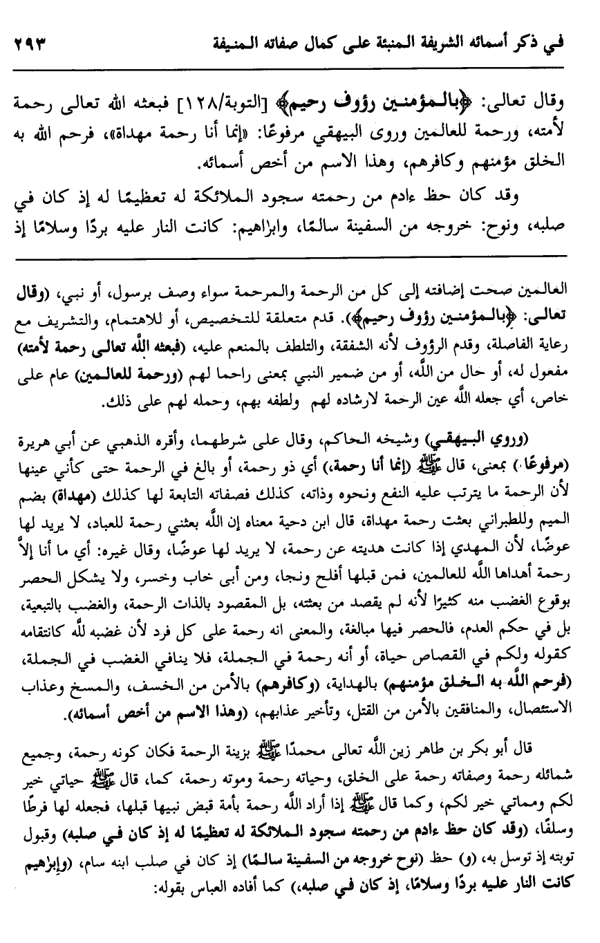 وقال تعالى: {بِالْمُؤْمِنِينَ رَءُوفٌ رَحِيم} [التوبة: 128] فبعثه الله تعالى رحمة لأمته، ورحمة للعالمين وروى البيهقي مرفوعا: "إنما أنا رحمة مهداة" فرحم الله به الخلق مؤمنهم وكافرهم، وهذا الاسم من أخص أسمائه.