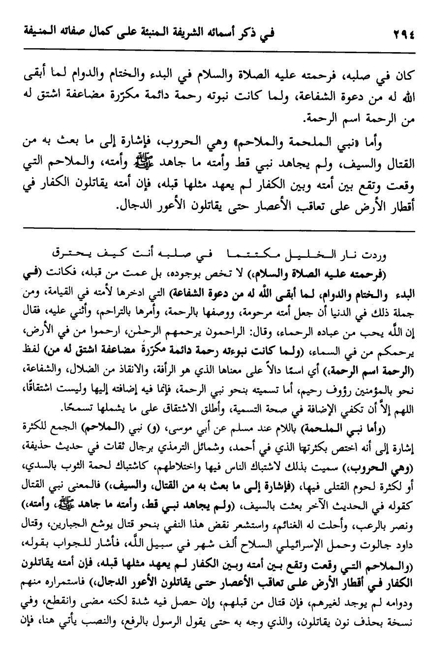 كان في صلبه، فرحمته عليه الصلاة والسلام في البدء والختام والدوام لما أبقى الله له من دعوة الشفاعة، ولما كانت نبوته رحمة دائمة مكررة مضاعفة اشتق له من الرحمة اسم الرحمة.