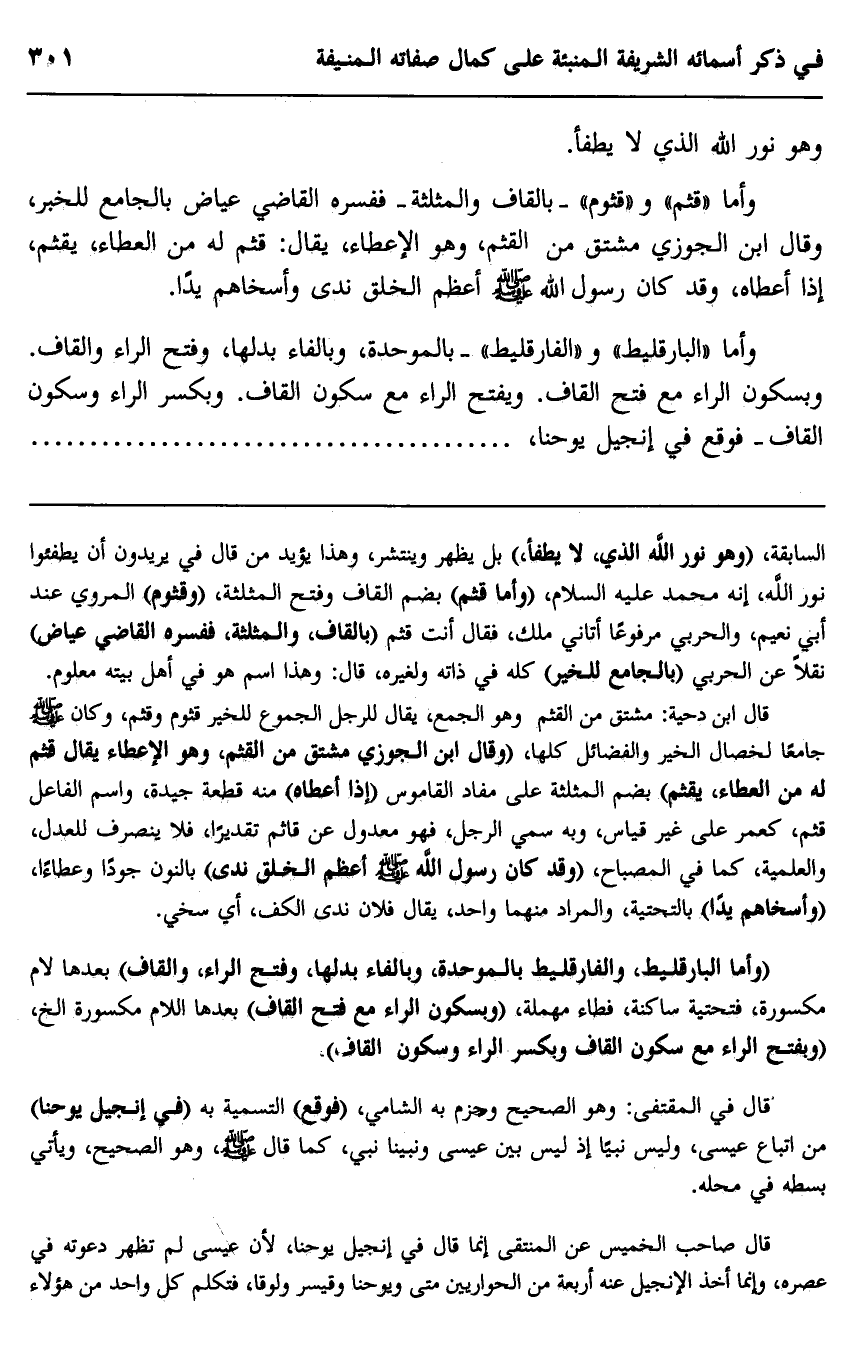 "وأما البارقليط، والفارقليط بالموحدة، وبالفاء بدلها، وفتح الراء، والقاف" بعدها لام مكسورة، فتحتية ساكنة، فطاء مهملة، "وبسكون الراء مع فتح القاف" بعدها اللام مكسورة إلخ، "وبفتح الراء مع سكون القاف وبكسر الراء وسكون القاف".