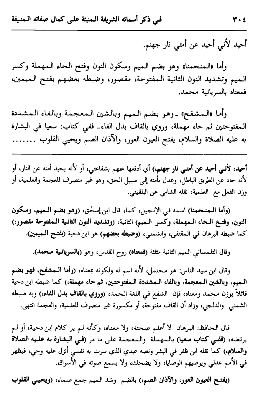 وقال ابن سيد الناس، هو محتمل؛ لأنه اسم له ولكونه بمعناه، "وأما المشفح، فهو بضم الميم وبالشين المعجمة، وبالفاء المشددة المفتوحتين ثم حاء مهملة"، كما ضبطه ابن دحية قائلا بوزن محمد ومعناه، فإن الشفع في اللغة الحمد، "وروي بالقاف بدل الفاء" وبه ضبطه الشمني والدلجي، وزاد أن القاف مفتوحة، أو مكسورة غير منصرف للعلمية، والعجمة انتهى.