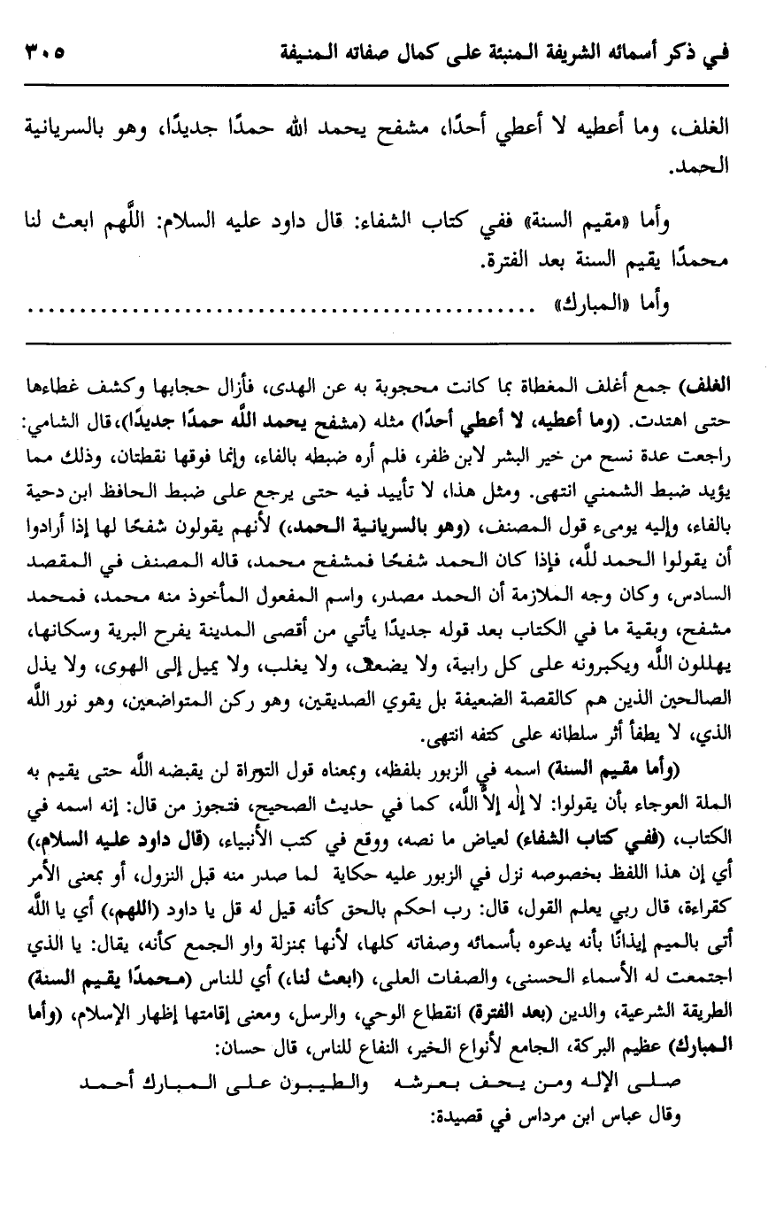"وأما مقيم السنة" اسمه في الزبور بلفظه، وبمعناه قول التوراة لن يقبضه الله حتى يقيم به الملة العوجاء بأن يقولوا: لا إله إلا الله، كما في الحديث الصحيح، فتجوز من قاله: إنه اسمه في الكتاب "ففي كتاب الشفاء" لعياض ما نصه، ووقع في كتب الأنبياء، "قال داود عليه السلام" أي إن هذا اللفظ بخصوصه نزل في الزبور عليه حكاية لما صدر منه قبل النزول، أو بمعنى الأمر كقراءة قال ربي يعلم القول، قال: رب احكم بالحق كأنه قيل له قل يا داود "اللهم" أي يا الله أتى بالميم إيذانا بأنه يدعوه بأسمائه وصفاته كلها؛ لأنها بمنزلة واو الجمع كأنه يقال: يا الذي اجتمعت له الأسماء الحسنى، والصفات العلي، "ابعث لنا" أي للناس "محمدا يقيم السنة" الطريقة الشرعية، والدين "بعد الفترة" انقطاع الوحي، والرسل، ومعنى إقامتها إظهار الإسلام، "وأما المبارك" عظيم البركة، الجامع لأنواع الخير، النفاع للناس، قال حسان: