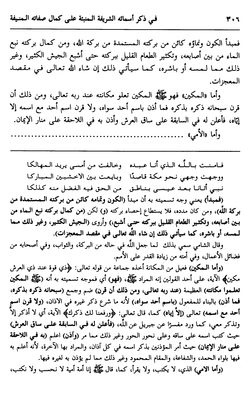 "فمبدأ" يعني وجه تسميته به أن مبدأ "الكون وتمامه كائن من بركته المستمدة من بركة الله"، ومن كان مدده فلا يستطاع إحصاء بركته "و" لكن "من كمال بركته نبع الماء من بين أصابعه، وتكثير الطعام القليل ببركته حتى أشبع"، وأروى "الجيش الكثير، وغير ذلك مما لمسه، أو باشره، كما سيأتي ذلك إن شاء الله تعالى في مقصد المعجزات".