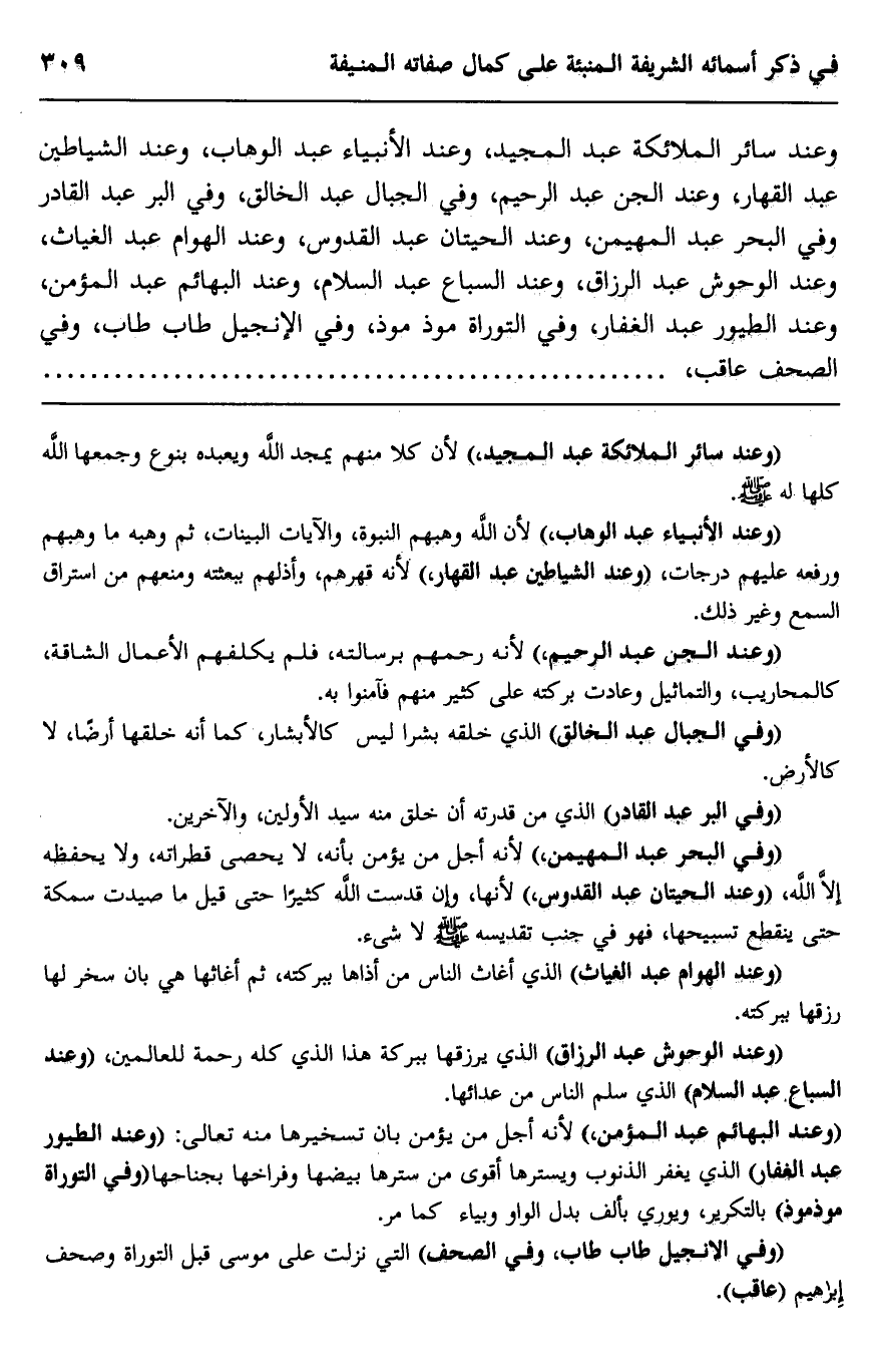 وعند سائر الملائكة عبد المجيد، وعند الأنبياء عبد الوهاب، وعند الشياطين عبد القهار، وعند الجن عبد الرحيم، وفي الجبال عبد الخالق، وفي البر عبد القادر وفي البحر عبد المهيمن، وعند الحيتان عبد القدوس، وعند الهوام عبد الغياث، وعند الوحوش عبد الرزاق، وعند السباع عبد السلام، وعند البهائم عبد المؤمن، وعند الطيور عبد الغفار، وفي التوراة موذ موذ، وفي الإنجيل طاب طاب، وفي الصحف عاقب،