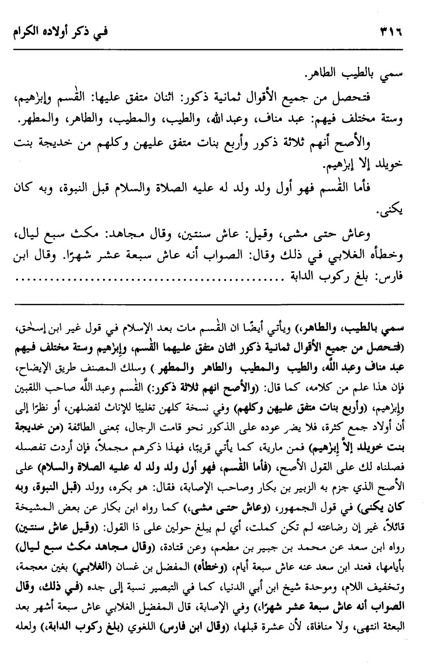 سمي بالطيب، والطاهر" ويأتي أيضا أن القاسم مات بعد الإسلام في قول غير ابن إسحاق، "فتحصل من جميع الأقوال ثمانية ذكور اثنان متفق عليهما القاسم، وإبراهيم وستة مختلف فيهم عبد مناف وعبد الله، والطيب والمطيب والطاهر والمطهر" وسلك المصنف طريق الإيضاح، فإن هذا علم من كلامه، كما قال: "والأصح أنهم ثلاثة ذكور:" القاسم وعبد الله صاحب اللقبين وإبراهيم، "وأربع بنات متفق عليهن وكلهم" وفي نسخة كلهن تغليبا للإناث لفضلهن أو نظرا إلى أن أولاد جمع كثرة، فلا يضر عوده على الذكور نحو قامت الرجال، بمعنى الطائفة، "من خديجة بنت خويلد إلا إبراهيم" فمن مارية، كما يأتي قريبا، فهذا ذكرهم مجملا، فإن أردت تفصيله فصلناه لك على القول الأصح "فأما القاسم فهو أول ولد ولد له عليه الصلاة والسلام" على الأصح الذي جزم به الزبير بن بكار وصاحب الإصابة، فقال: هو بكره، وولد "قبل النبوة، وبه كان يكنى" في قول الجمهور "وعاش حتى مشى" كما رواه ابن بكار عن بعض المشيخة قائلا، غير إن رضاعته لم تكن كملت، أي لم يبلغ حولين على ذا القول: "وقيل عاش سنتين" رواه ابن سعد عن محمد بن جبير بن مطعام، وعن قتادة، "وقال مجاهد مكث سبع ليال" بأيامها فعند ابن سعد عنه عاش سبعة أيام، "وخطأه المفضل بن غسان "الغلابي" بغين معجمة، وتخفيف اللام، وموحدة شيخ ابن أبي الدنيا كما في التبصير نسبة إلى جده، "في ذلك، وقال الصواب أنه عاش سبعة عشر شهرا" وفي الإصابة قال المفضل الغلابي عاش سبعة أشهر بعد البعثة انتهى، ولا منافاة لأن عشرة قبلها، "وقال ابن فارس" اللغوي "بلغ ركوب الدابة" ولعله