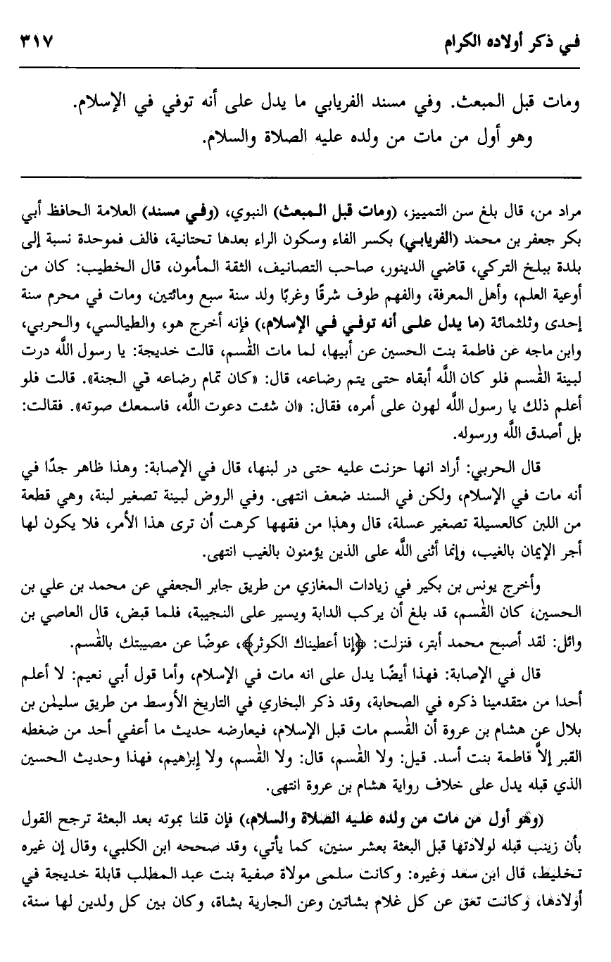مراد من قال بلغ سن التمييز، "ومات قبل المبعث"، النبوي، "وفي مسند" العلامة الحافظ أبي بكر جعفر بن محمد "الفريابي" بكسر الفاء وسكون الراء بعدها تحتانية، فألف فموحدة نسبة إلى بلدة بيلخ التركي، قاضي الدينور، صاحب التصانيف، الثقة المأمون قال الخطيب: كان أوعية العلم، وأهل المعرفة، والفهم طوف شرقا وغربا ولد سنة سبع ومائتين، ومات في محرم سنة إحدى وثلاثمائة "ما يدل على أنه توفي في الإسلام" فإنه أخرج هو، والطيالسي والحربي وابن ماجه عن فاطمة بنت الحسين عن أبيها، لما مات القاسم، قالت خديجة: يا رسول الله درت لبينة القاسم فلو كان الله أبقاه حتى يتم رضاعه، قال: "كان تمام رضاعه في الجنة". قالت فلو أعلم ذلك يا رسول الله لهون علي أمره، فقال: "إن شئت دعوت الله، فاسمعك صوته". فقالت: بل أصدق الله ورسوله.