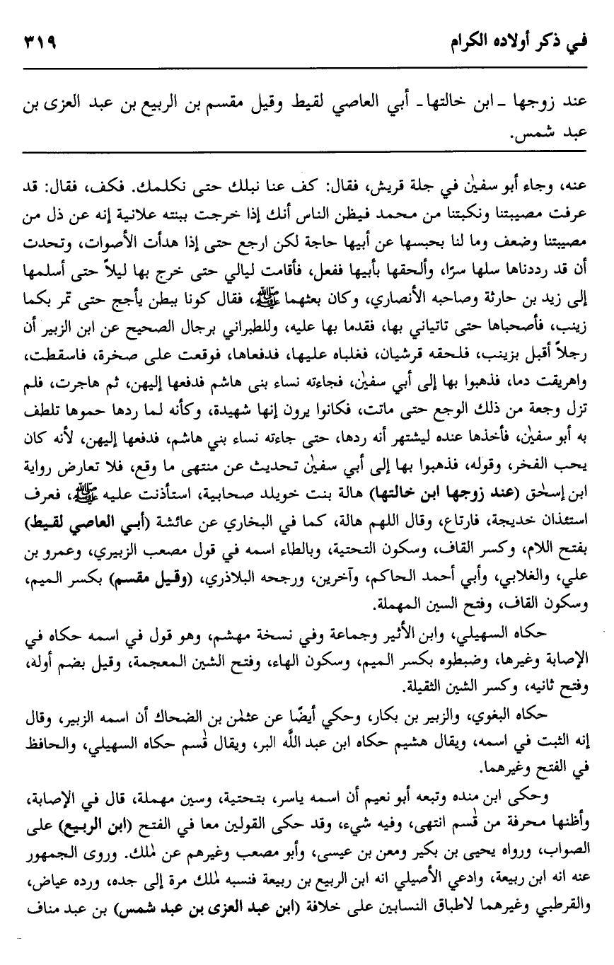 عنه وجاء أبو سفيان في جلة قريش كف عنا نبلك حتى نكلمك فكف فقال: قد عرفت مصيبتنا ونكبتنا من محمد فيظن الناس أنك إذا خرجت ببنته علانية أنه عن ذل من مصيبتنا وضعف وما لنا بحبسها عن أبيها حاجة لكن ارجع حتى إذا هدأت الأصوات وتحدث أن قد رددناها سلها سرا وألحقها بأبيها ففعل فأقامت ليالي حتى خرج بها ليلا حتى أسلمها إلى زبد بن حارثة وصاحبه الأنصاري، وكان بعثهما صلى الله عليه وسلم فقال كونا ببطن يأجج حتى تمر بكما زينب، فأصحباها حتى تاتياني بها، فقدما بها عليه، وللطبراني برجال الصحيح عن ابن الزبير أن رجلا أقبل بزينب فلحقه قرشيان فغلباه عليها، فدفعاها فوقعت على صخرة، فاسقطت، واهريقت دما فذهبوا بها إلى أبي سفيان فجاءته نساء بني هاشم فدفعها إليهن، ثم هاجرت فلم تزل وجعة من ذلك الوجع حتى ماتت فكانوا يرون إنها شهيدة وكأنه لما ردها حموها تلطف به أبو سفيان، فأخذها عنده ليشتهر أنه ردها، حتى جاءته نساء بني هاشم فدفعها إليهن؛ لأنه كان يحب الفخر، وقوله، فذهبوا بها إلى أبي سفيان تحديث عن منتهى ما وقع، فلا تعارض رواية ابن إسحاق "عند زوجها ابن خالتها" هالة بنت خويلد، صحابية، استأذنت عليه صلى الله عليه وسلم فعرف استئذان خديجة فارتاع وقال اللهم هالة، كما في البخاري عن عائشة "أبي العاصي لقيط" بفتح اللام وكسر القاف وسكون التحتية، وبالطاء اسمه في قول مصعب الزبيري، وعمرو بن علي، والغلابي، وأبي أحمد الحاكم، وآخرين، ورجحه البلاذري، "وقيل مقسم" بكسر الميم وسكون القاف، وفتح السين المهملة.