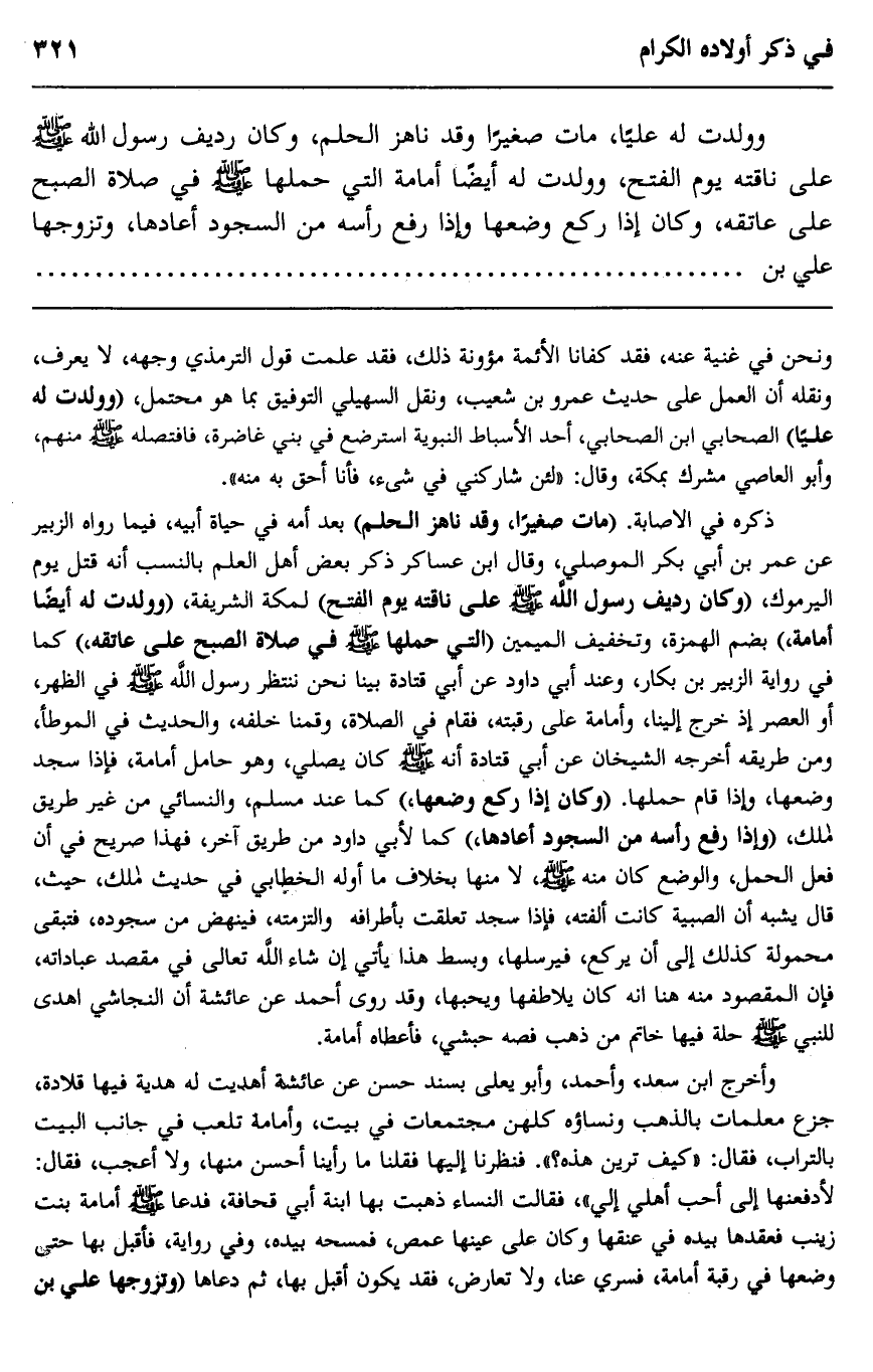 ذكره في الإصابة. "مات صغيرا، وقد ناهز الحلم" بعد أمه في حياة أبيه، فيما رواه الزبير عن عمر بن أبي بكر الموصلي، وقال ابن عساكر ذكر بعض أهل العلم بالنسب أنه قتل يوم اليرموك، "وكان رديف رسول الله صلى الله عليه وسلم على ناقته يوم الفتح" لمكة الشريفة، "وولدت له أيضا أمامه، بضم الهمزة، وتخفيف الميمين "التي حملها صلى الله عليه وسلم في صلاة الصبح على عاتقه"، كما في رواية الزبير بن بكار، وعند أبي داود عن أبي قتادة بينا نحن ننتظر رسول الله صلى الله عليه وسلم في الظهر، أو العصر إذ خرج إلينا وأمامه على رقبته، فقام في الصلاة، وقمنا خلفه، والحديث في الموطأ، ومن طريقه أخرجه الشيخان عن أبي قتادة أنه صلى الله عليه وسلم كان يصلي، وهو حامل أمامه، فإذا سجد وضعها، وإذا قام حملها. "وكان إذا ركع وضعها" كما عند مسلم، والنسائي من غير طريق مالك، "وإذا رفع رأسه من السجود أعادها" كما لأبي داود من طريق آخر، فهذا صريح في أن فعل الحمل، والوضع كان منه صلى الله عليه وسلم، لا منها بخلاف ما أوله الخطابي في حديث مالك، حيث، قال يشبه أن الصبية كانت ألفته، فإذا سجد تعلقت بأطرافه والتزمته، فينهض من سجوده، فتبقى محمولة كذلك إلى أن يركع، فيرسلها، وبسط هذا يأتي إن شاء الله تعالى في مقصد عباداته، فإن المقصود منه هنا أنه كان يلاطفها ويحبها، وقد روى أحمد عن عائشة أن النجاشي اهدى للنبي صلى الله عليه وسلم حلة فيها خاتم من ذهب فصه حبشي، فأعطاه أمامة.