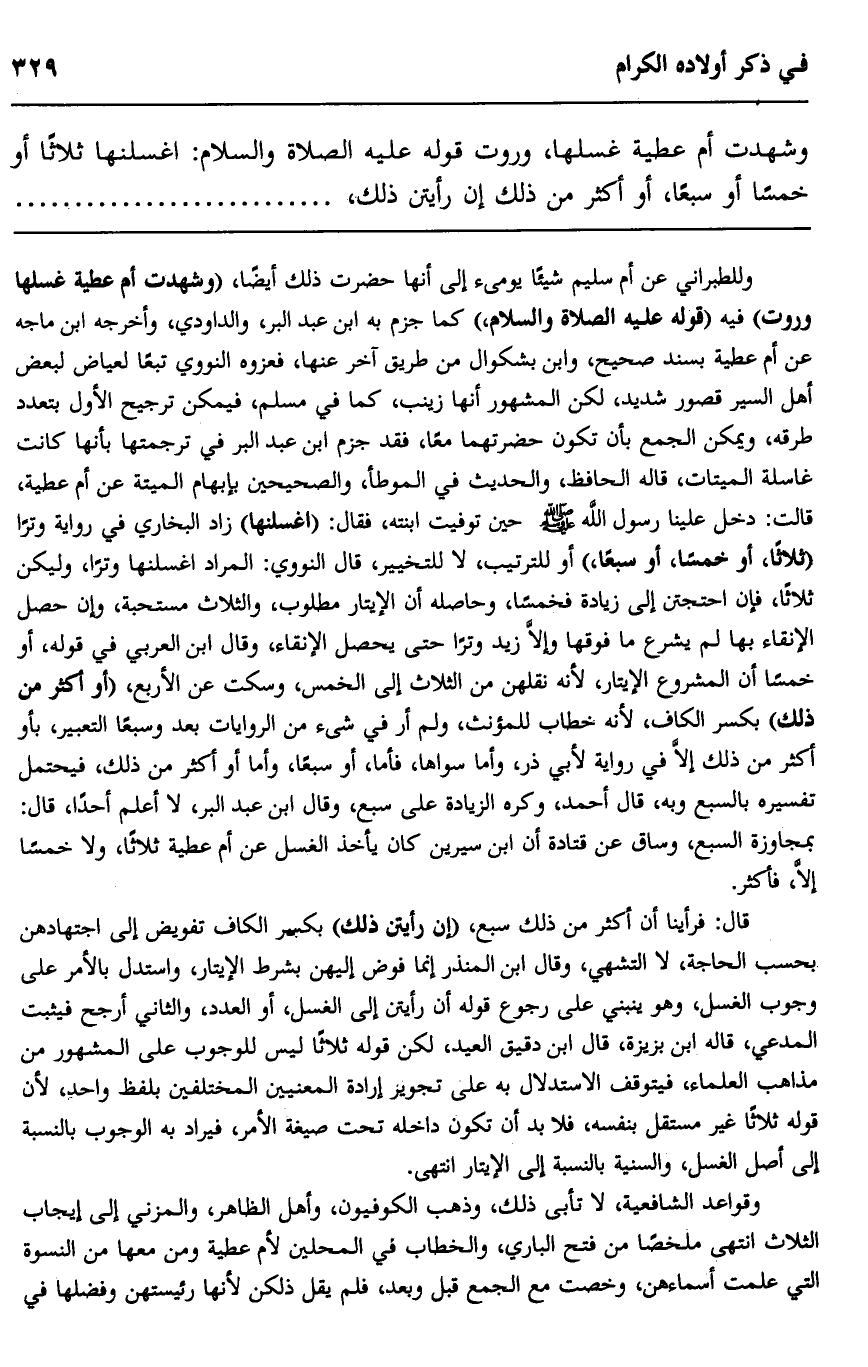 وللطبراني عن أم سليم شيئا يوميء إلى أنها حضرت ذلك أيضا، "وشهدت أم عطية غسلها وروت" فيه "قوله عليه الصلاة والسلام" كما جزم به ابن عبد البر، والداودي، وأخرجه ابن ماجه عن أم عطية بسند صحيح، وابن بشكوال من طريق آخر عنها، فعزوه النووي تبعا لعياض لبعض أهل السير قصور شديد، لكن المشهور أنها زينب، كما في مسلم، فيمكن ترجيح الأول بتعدد طرقه، ويمكن الجمع بأن تكون حضرتهما معا، فقد جزم ابن عبد البر في ترجمتها بأنها كانت غاسلة الميتات، قاله الحافظ، والحديث في الموطأ، والصحيحين بإبهام الميتة عن أم عطية، قالت: دخل علينا رسول الله صلى الله عليه وسلم حين توفيت ابنته، فقال: "اغسلنها" زاد البخاري في رواية "وترا" "ثلاثا، أو خمسا، أو سبعا" أو للترتيب، لا للتخيير، قال النووي: المراد اغسلنها وترا، وليكن ثلاثا، فإن احتجتن إلى زيادة فخمسا، وحاصله أن الإيتار مطلوب، والثلاث مستحبة، وإن حصل الإنقاء بها لم يشرع ما فوقها وإلا زيد وترا حتى يحصل الإنقاء، وقال ابن العربي في قوله، أو خمسا، أن المشروع الإيتار؛ لأنه نقلهن من الثلاث إلى الخمس، وسكت عن الأربع، "أو أكثر من ذلك" بكسر الكاف؛ لأنه خطاب للمؤنث، ولم أر في شيء من الروايات بعد وسبعا التعبير، بأو أكثر من ذلك إلا في رواية لأبي ذر، وأما سواها، فأما، أو سبعا، وأما أو أكثر من ذلك، فيحتمل تفسيره بالسبع وبه، قال أحمد، وكره الزيادة على سبع، وقال ابن عبد البر، لا أعلم أحدا، قال: بمجاوزة السبع، وساق عن قتادة أن ابن سيرين كان يأخذ الغسل عن أم عطية ثلاثا، ولا خمسا إلا، فأكثر.